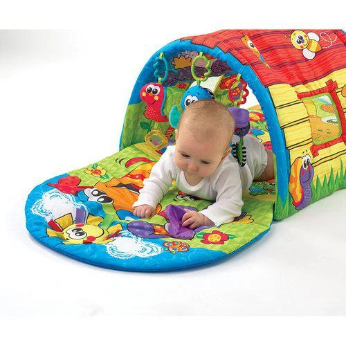Hrací deka s tunelem obsahuje i mnoho aktivit: visací hračky, ptáček vydává zvuky, zrcadlo a mnohé další, takže dítě bude mít co objevovat a zkoumat.
