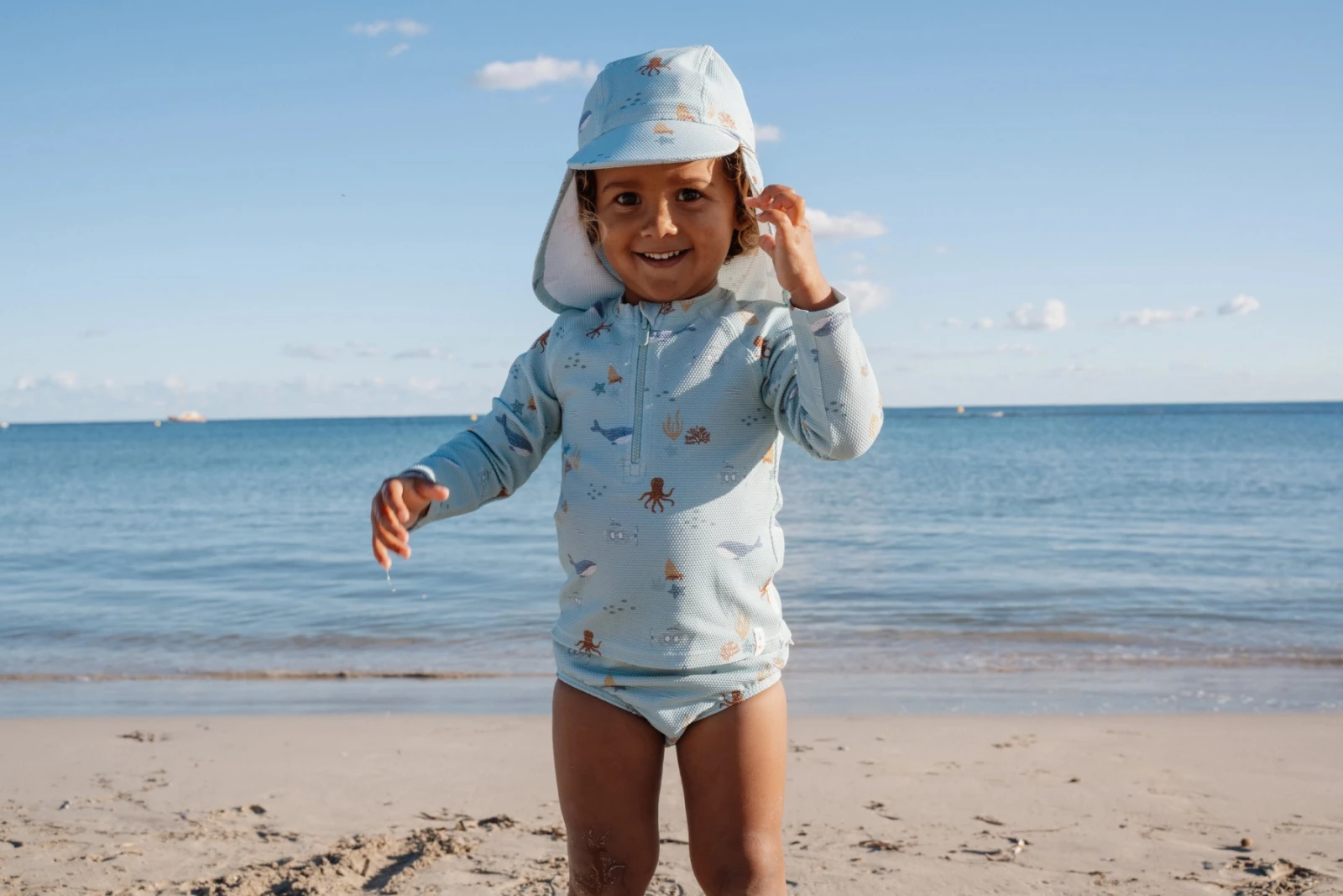 Čepička s krásným potiskem chrání vaše dítě před sluncem při koupání u moře i doma na zahradě. Ať už vaše děti milují skákání ve vlnách, koupání v bazénu nebo si rády staví hrady z písku, s touto čepičkou si mohou bezstarostně užívat celý den.