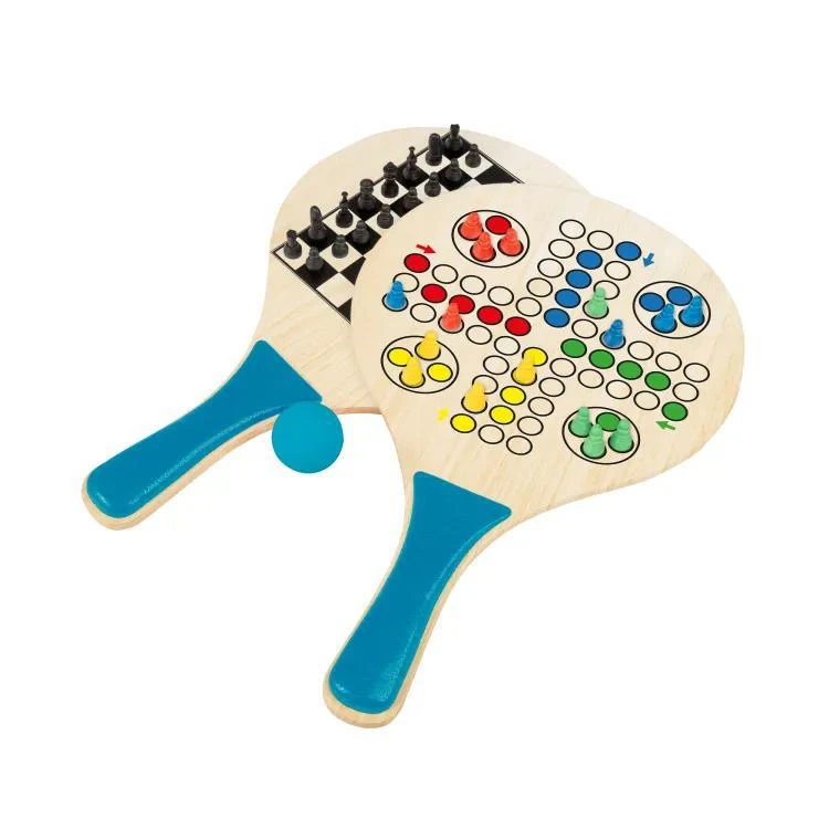 Sada obsahuje: 2 dřevěné rakety, 1 plastový míček, 32 figurek na šachy, 16 figurek na Člověče, nezlob se, 1 kostku a 1 pouzdro na rakety.
