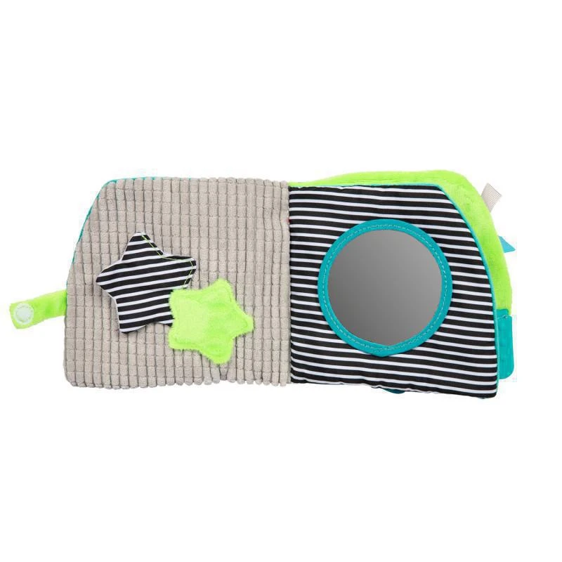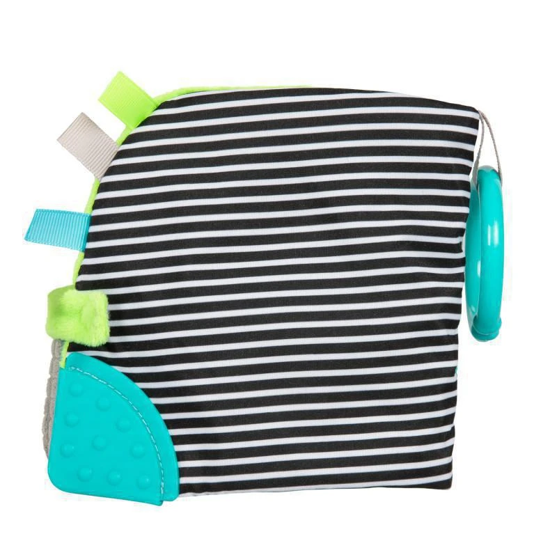 Jedna ze stran je zdobena výraznými černo-bílými proužky, které jsou pro nejmenší děti dobře viditelné a pomáhají rozvíjet první vnímání kontrastů a barev. Součástí je také pružné kousátko, které poskytuje úlevu při svědění dásní a zároveň podporuje hmatové objevování. Knížka je lehká, měkká a bezpečná do postýlky, kočárku i na cestování.