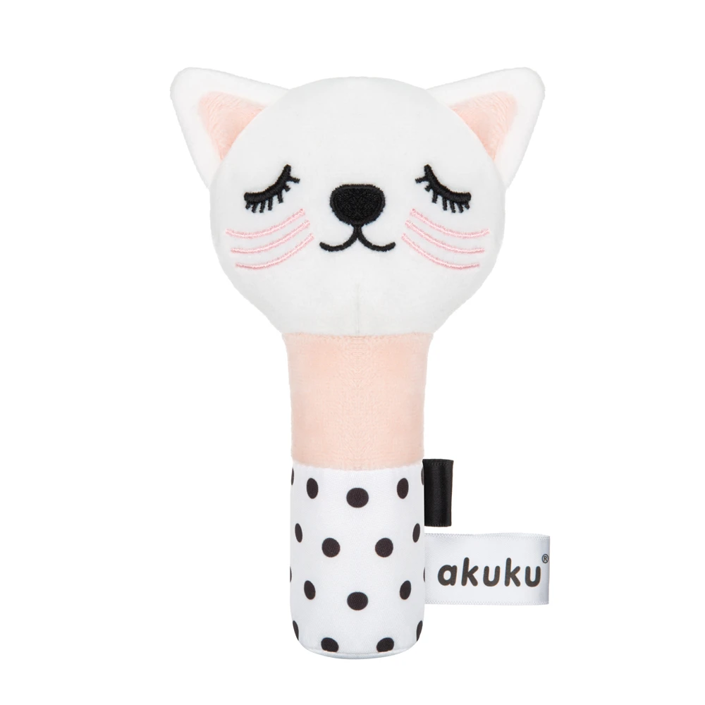 Plyšová kočička s chrastítkem a pískátkem je stvořena s láskou pro nejmenší děti. Vyrobena z měkkých, příjemných materiálů, které jsou šetrné k citlivé dětské pokožce. Díky lehké konstrukci je ideální do malých ručiček – snadno se drží a podporuje rozvoj úchopových schopností. Jemný chrastící a pískací zvuk stimuluje sluch a koordinaci dítěte, zatímco šusticí prvky podněcují jeho zvídavost. Kočička má zavřená očička, růžové tvářičky a módní puntíkovaný úchyt – okouzlí děti i rodiče.