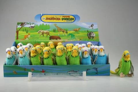 Plyšová Andulka o velikosti cca 12 cm. Po zmáčknutí na křídle,Andulka švitoří.