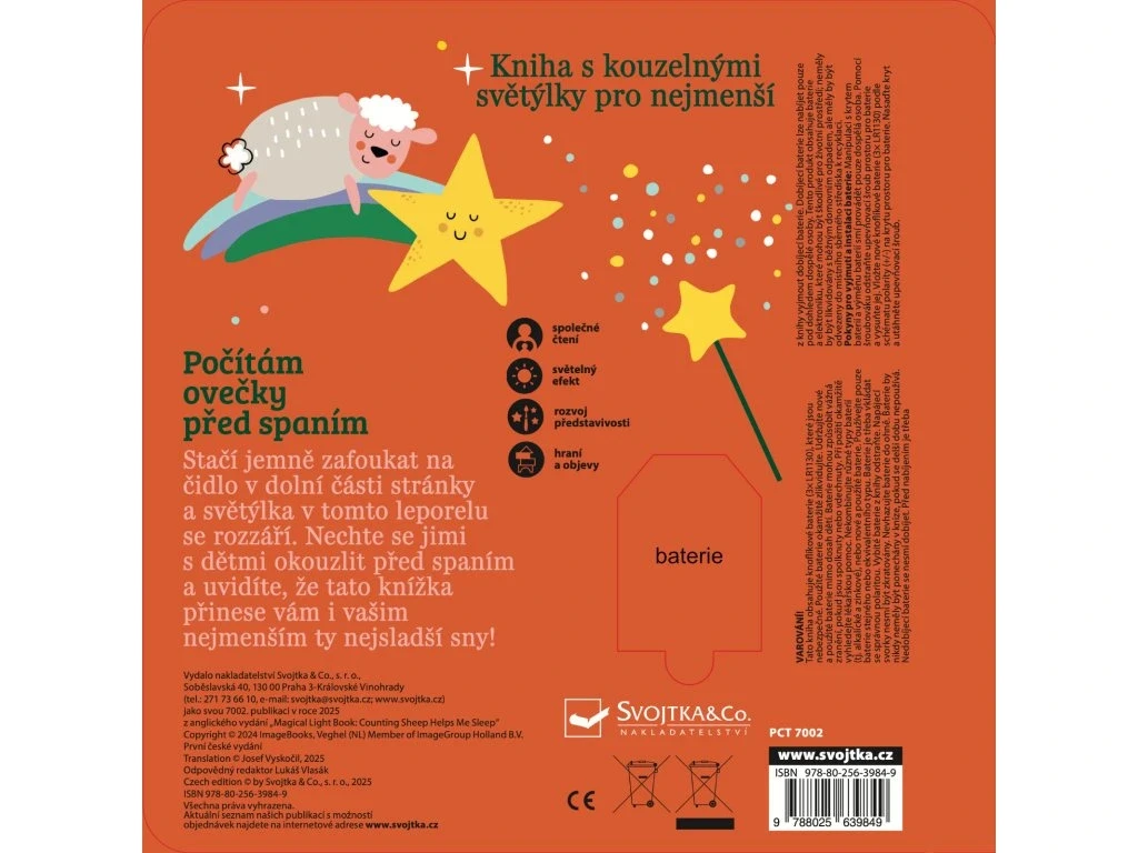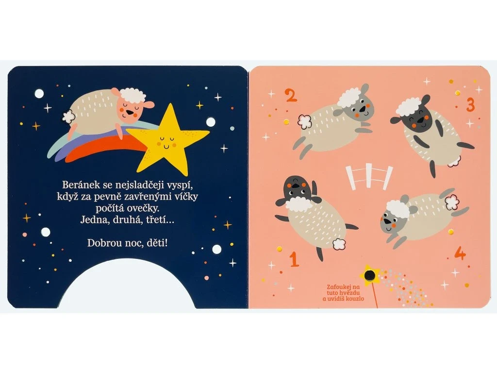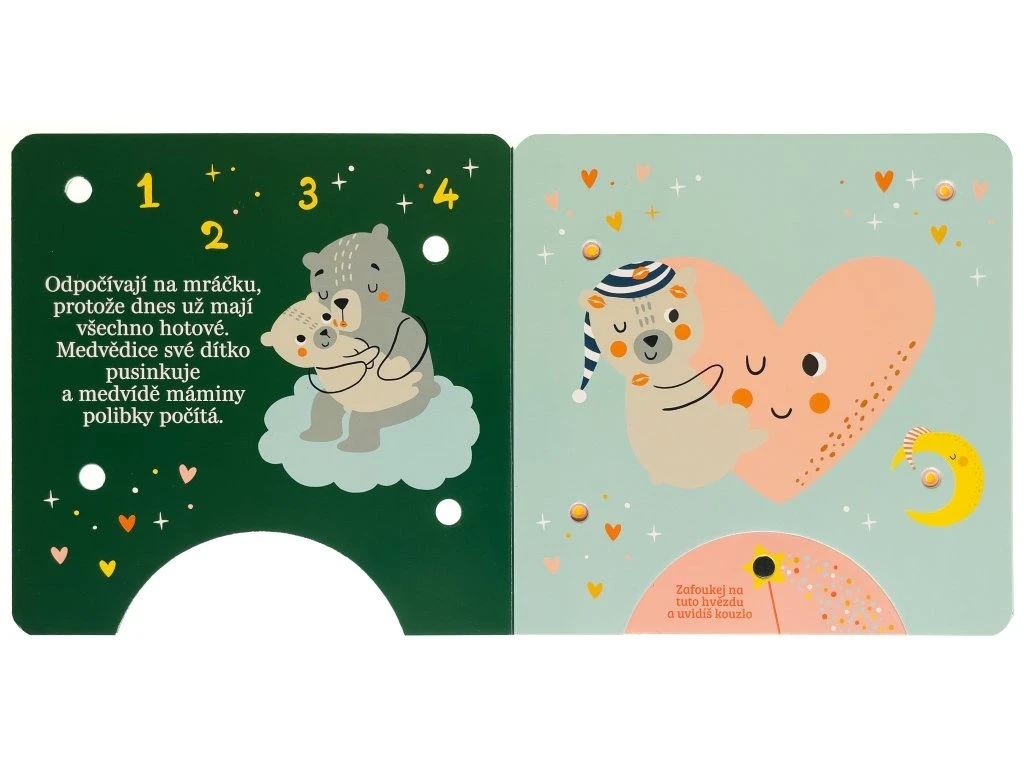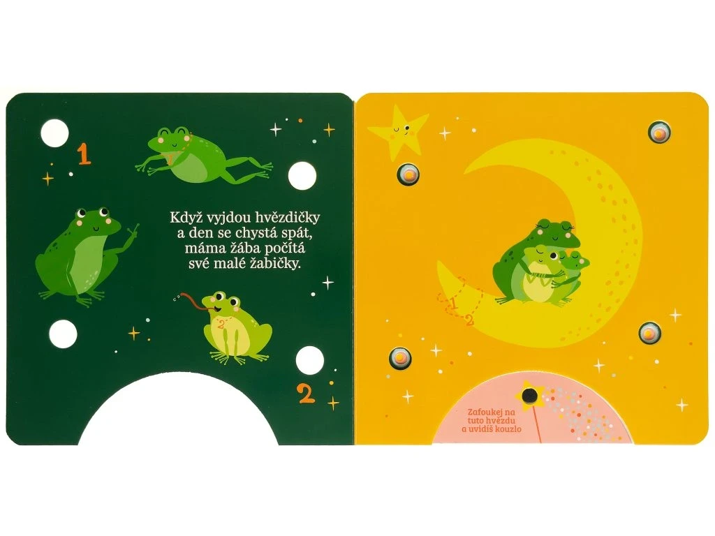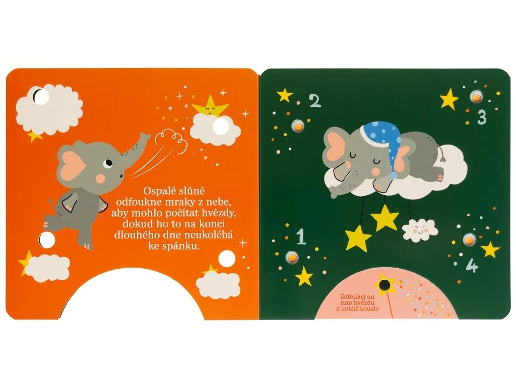 Stačí jemně zafoukat na čidlo v dolní části knihy a na stránkách se rozzáří kouzelná světýlka! Toto půvabné leporelo děti provede uklidňujícím večerním rituálem, kdy spolu s žabičkami, slůnětem, medvídětem i beránkem počítají hvězdičky a ovečky, než usnou. Krátké veršované texty a roztomilé ilustrace podporují představivost a navozují klidnou atmosféru před spaním. Díky interaktivnímu principu "foukni a rozsviť" se čtení mění v malý zázrak, který pomáhá dětem uvolnit se, zklidnit a s úsměvem usínat. Ideální večerní rituál pro ty nejsladší sny.
