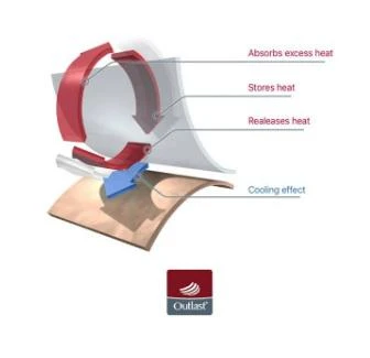 Spodní stranu poznáte díky černé síťovině, která poskytuje dokonalou prodyšnost. Podložka je díky 3D textilii krásně měkká a pohodlná. Vrchní stranu jsme zhotovili z termoregulačního materiálu Outlast®, který je navázaný na bavlnu. Outlast® vytváří ideální teplotní podmínky a udržuje stálou teplotu mezi pokožkou a tkaninou. Když se teplota zvýší, ať už díky rychlému pohybu či zvýšením okolní teploty, Outlast® teplo odebere dřív, než se pokožka začne potit.