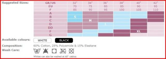 VELIKOST L odpovídá velikost podprsenek: 90A, 95A, 100A, 90B, 95B, 85 C, 90 C, 95C, 85 D, 90 D,80 E, 85E, 75 F, 80 F