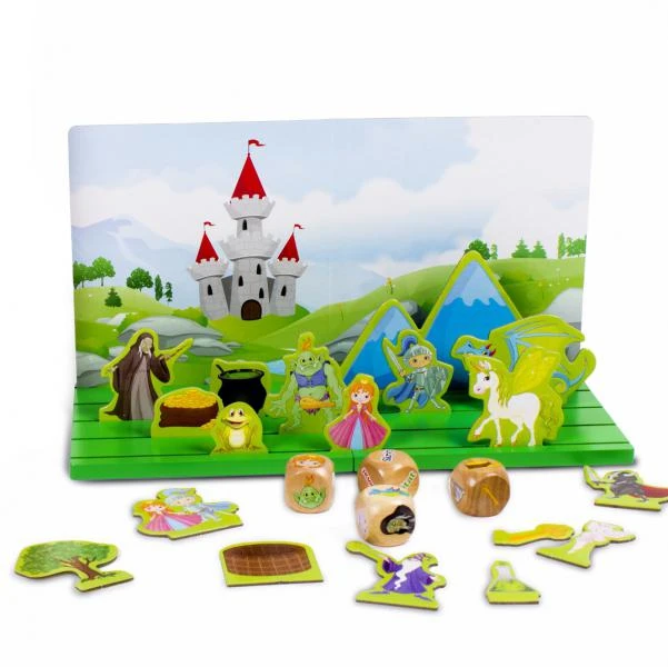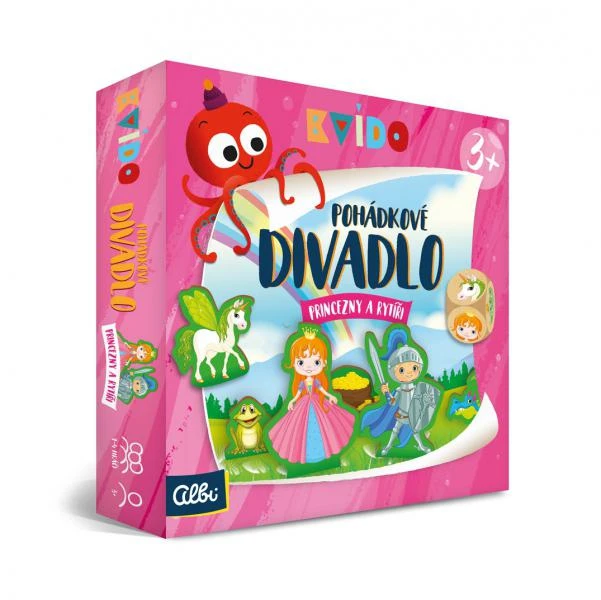 Jak se Pohádkové divadlo od Kvída hraje? Hráči postaví divadlo s kulisami a několika doplňujícími rekvizitami. Nejmladší hráč hodí třemi kostkami a určí, které postavy budou hrát v jeho příběhu a 4. akční kostka představuje, jaká akce se v příběhu odehraje, např. pirát schová poklad nebo princ běží k drakovi, aby s ním bojoval apod. Dítě začíná vyprávět příběh dle vlastní fantazie. Řekne první dvě věty a předá kostky dalšímu hráči, který pokračuje v příběhu a hodem kostkami přidá další postavy. Hra končí po dohodě hráčů, až je příběh dokončený.
