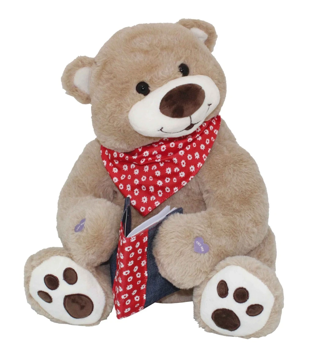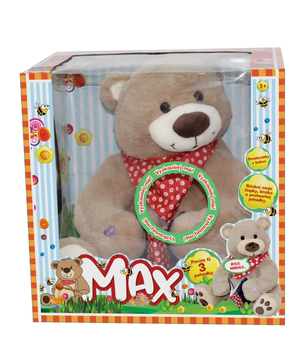 Příjemná kvalitní plyš. Medvídek je vhodný pro děti od 2 let. Vypráví 3 pohádky. Medvídek je v sedě vysoký cca 36 cm. Součástí balení je sešit plný omalovánek