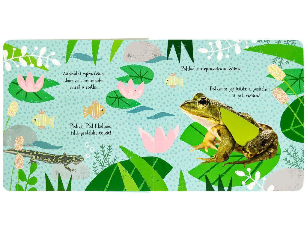 Vítej na zahradě a seznam se s jejími obyvateli. Pohlaď si žábu, čmeláka nebo kočku a poslechni si zvuky, které vydávají. Dozvíš se o zvířatech ze zahrady pár zajímavostí a podíváš se, jak žijí. Tato zvuková kniha s hmatovými prvky je ideální pro menší děti, které si s její pomocí procvičují většinu smyslů naráz.