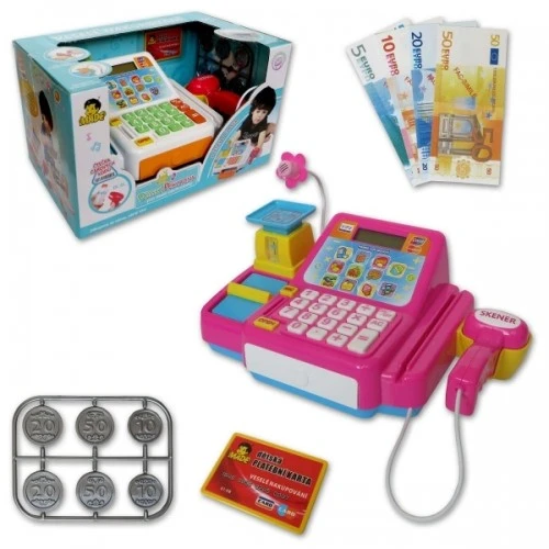 Funkční pokladna se scanerem a váhou, zvukovými a světelnými efekty. Pokladna mluvící česky o rozměrech cca 22,5 cm X 18 cm X 9 cm pro malé obchodníky.Display s kalkulačkou,simulace platby kartou,mikrofon zesilující hlas,čtečka čárových k
