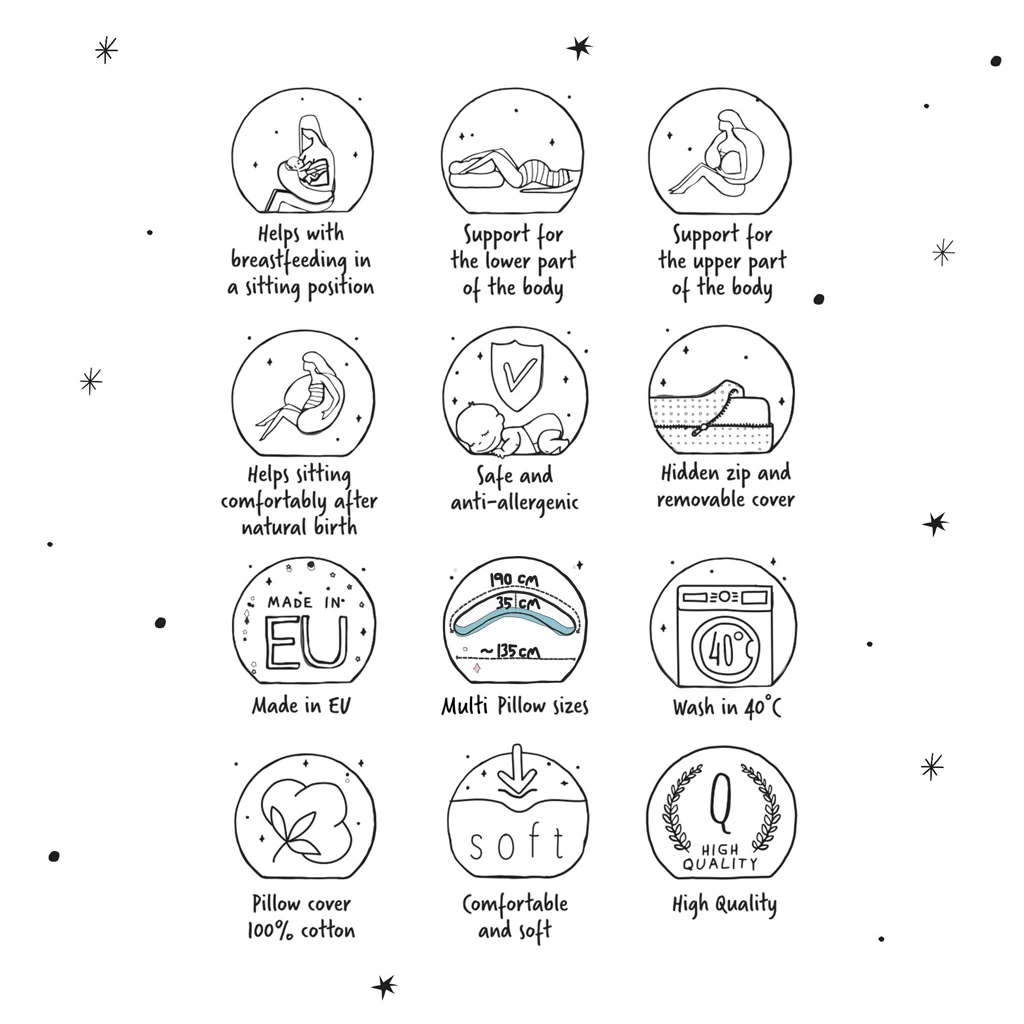 Důležité: Před každým použitím vždy zkontrolujte stav polštáře, aby byla zajištěna maximální bezpečnost a pohodlí pro vás i vaše dítě.