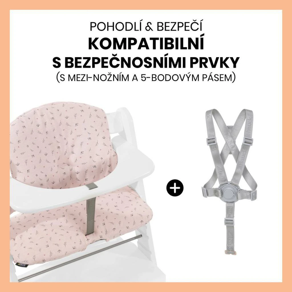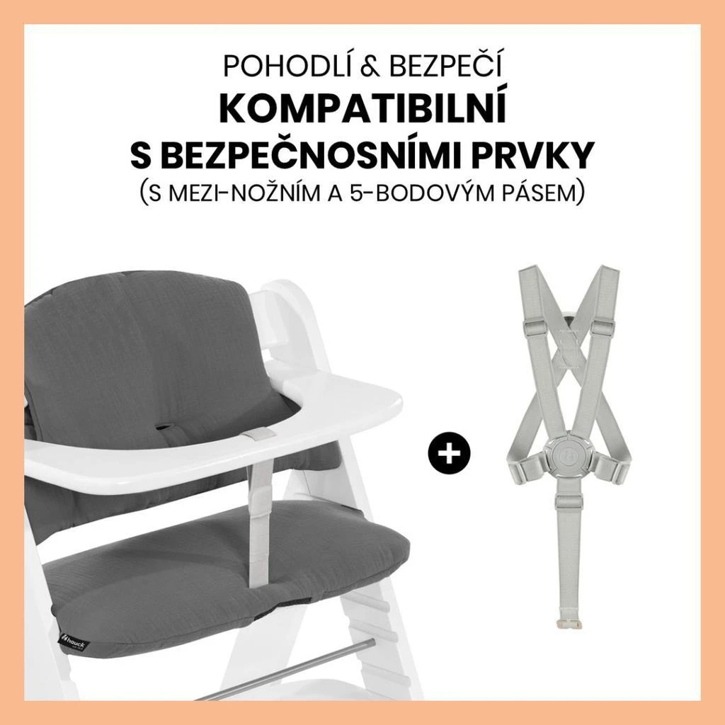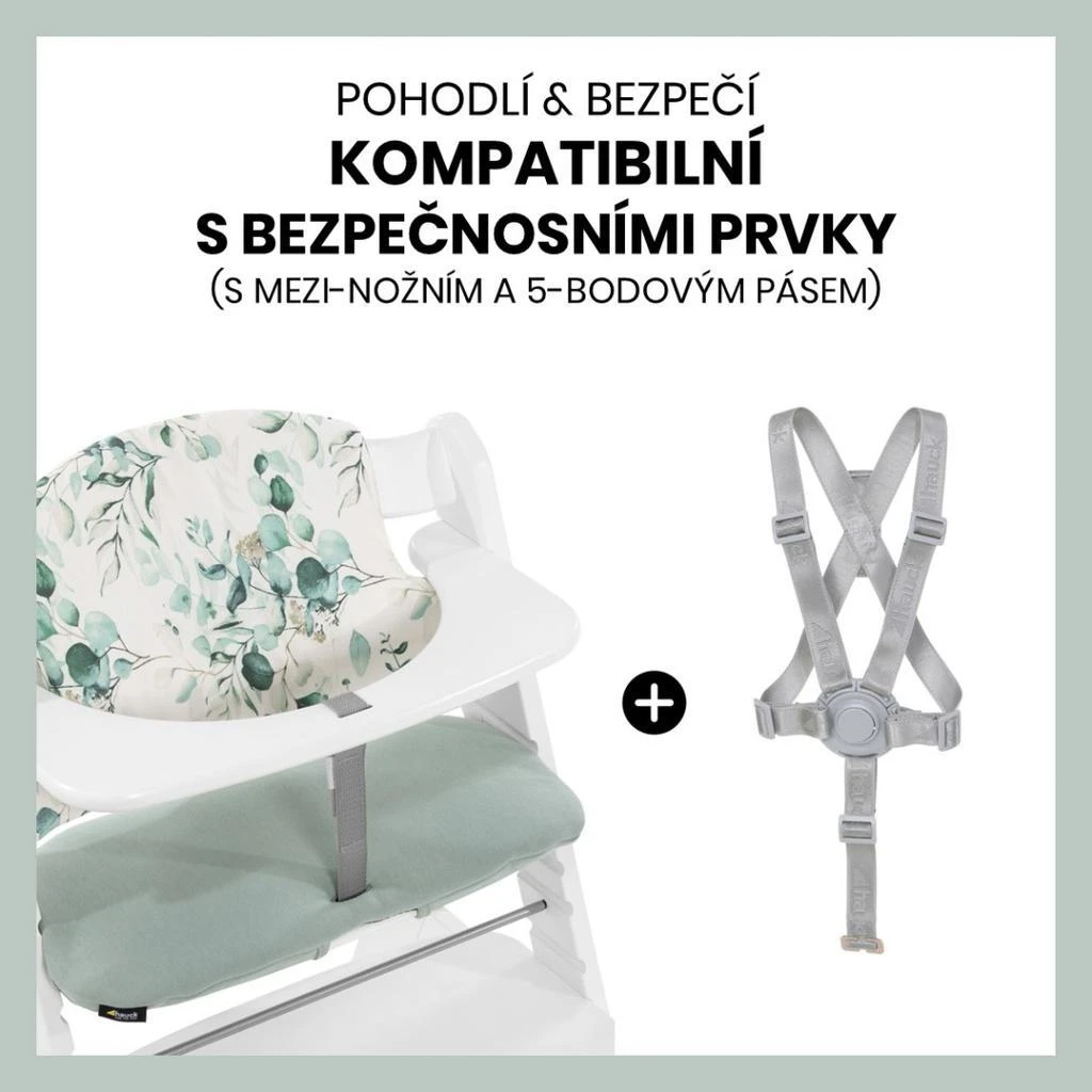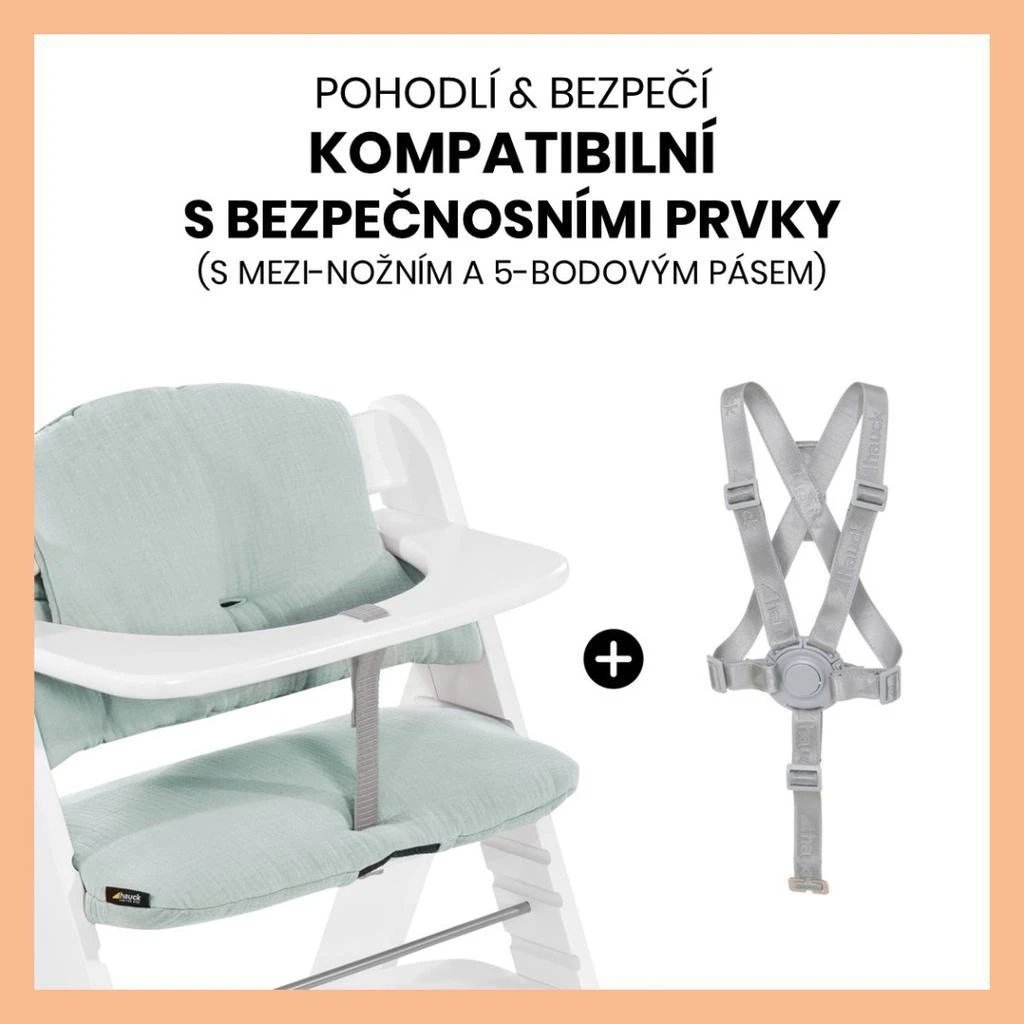Sedátko je kompatibilní s mezi-nožním a 5-bodovým bezpečnostním pásem: Všechny dřevěné židličky hauck jsou vybaveny rozkrokovým a pětibodovým bezpečnostním pásem. Polstrování je plně kompatibilní s těmito bezpečnostními prvky tak, aby vaše děťátko mohlo být vždy v pohodlí a bezpečí – v každém věku!