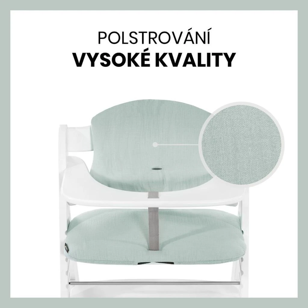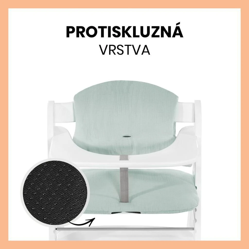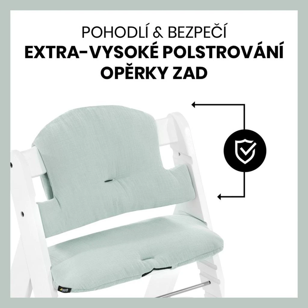 Snadné upevnění k jídelní židličce - Jednoduché, rychlé a praktické: Polstrování na židlička Select lze snadno připevnit k vysoké židličce. Žerzejová verze se připevňuje pomocí háčku a poutka; mušelínová verze pomocí patentek. A pokud je potřebujete vyčistit – stačí je hodit do pračky.