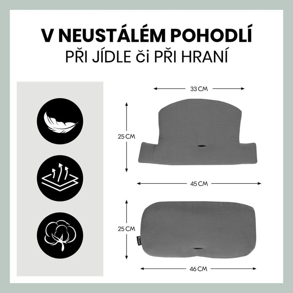 Opravdové pohodlí při stolování i při hraní: Polstrování z prodyšné bavlny nabízí úžasně měkoučký set na dřevěné židličky. Extra polstrovaná záda poskytují děťátku opravdové pohodlí při stolování i při hraní.