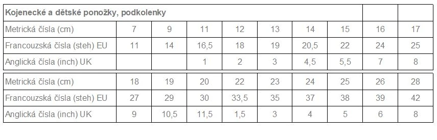 | Velikosti ponožek | 20 - 22 (6 - 18 měsíců) / 23 - 25 (2 - 3 roky) / 26 - 28 / 29 - 31 / 32 - 34 / 35 - 37 |
