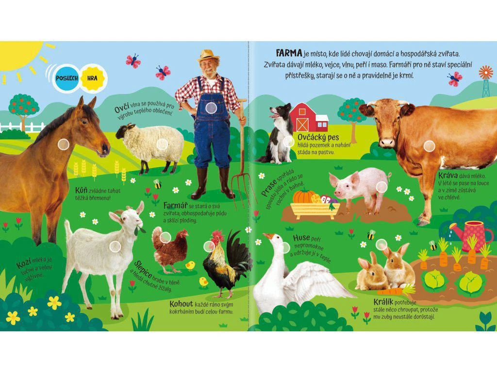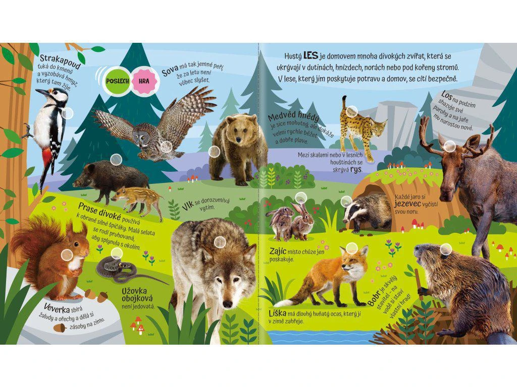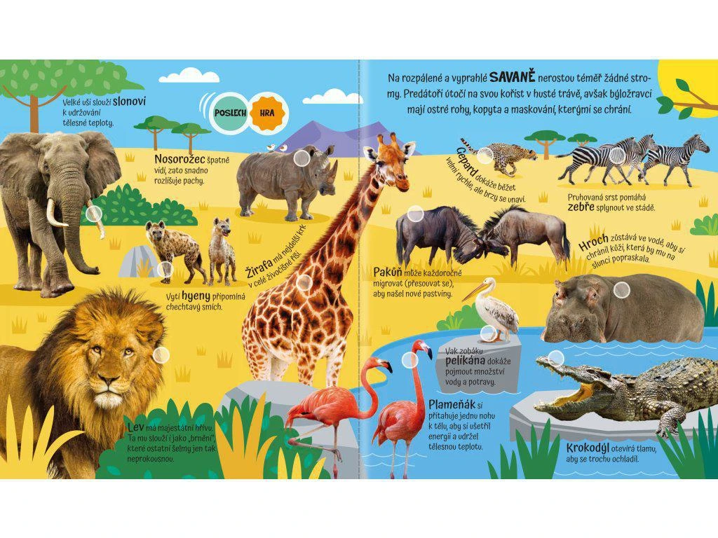 Prozkoumej s touto interaktivní zvukovou knihou africkou savanu, tajemnou Austrálii i mrazivé póly! Na stránkách se seznámíš se spoustou zvířat, například s podivným ptakopyskem, s černobílým tapírem či s mohutným pižmoněm! Poslechni si hlasitého jaguára, houkající sovu nebo bučící krávu! Víš, proč mají zebry pruhy? Které zvíře shazuje na podzim parohy? A jakou barvu má jazyk ledního medvěda? V této knize se dozvíš mnoho faktů o zvířatech, poslechneš si názvy a zvuky zvířat a v režimu hry budeš hledat správná zvířata. Bav se a poznej úžasný a zajímavý svět zvířat!