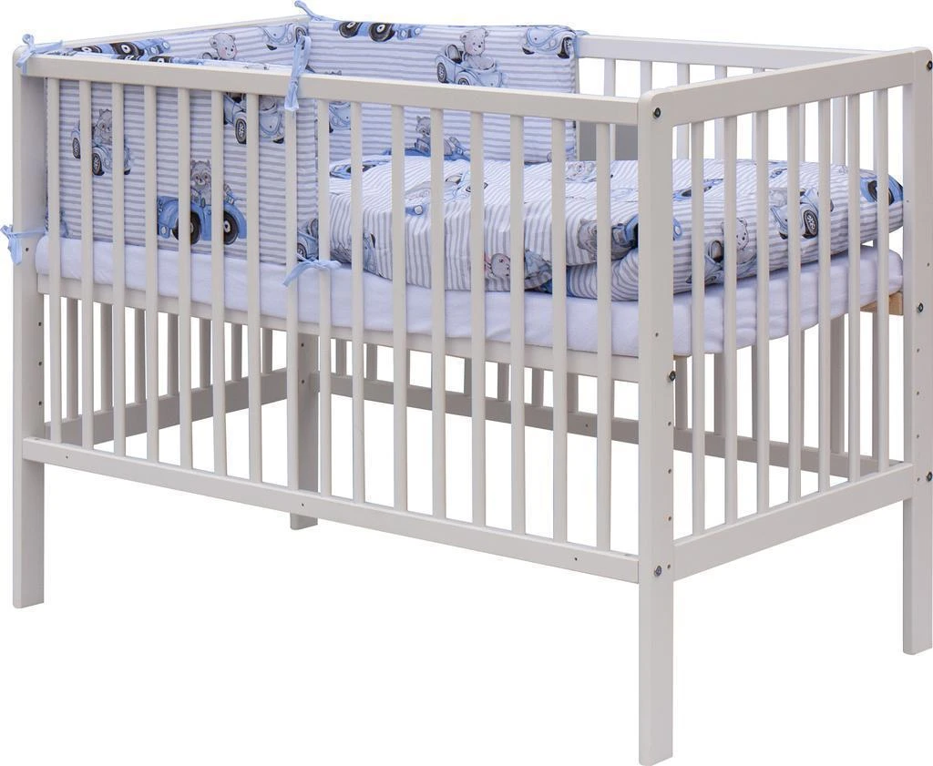 1. Dětská dřevěná postýlka 120 x 60 cm - bílá, masiv borovice, 3 vyndavací příčky, 5 poloh roštu, nohy postýlky jsou předvrtané pro nasazení koleček