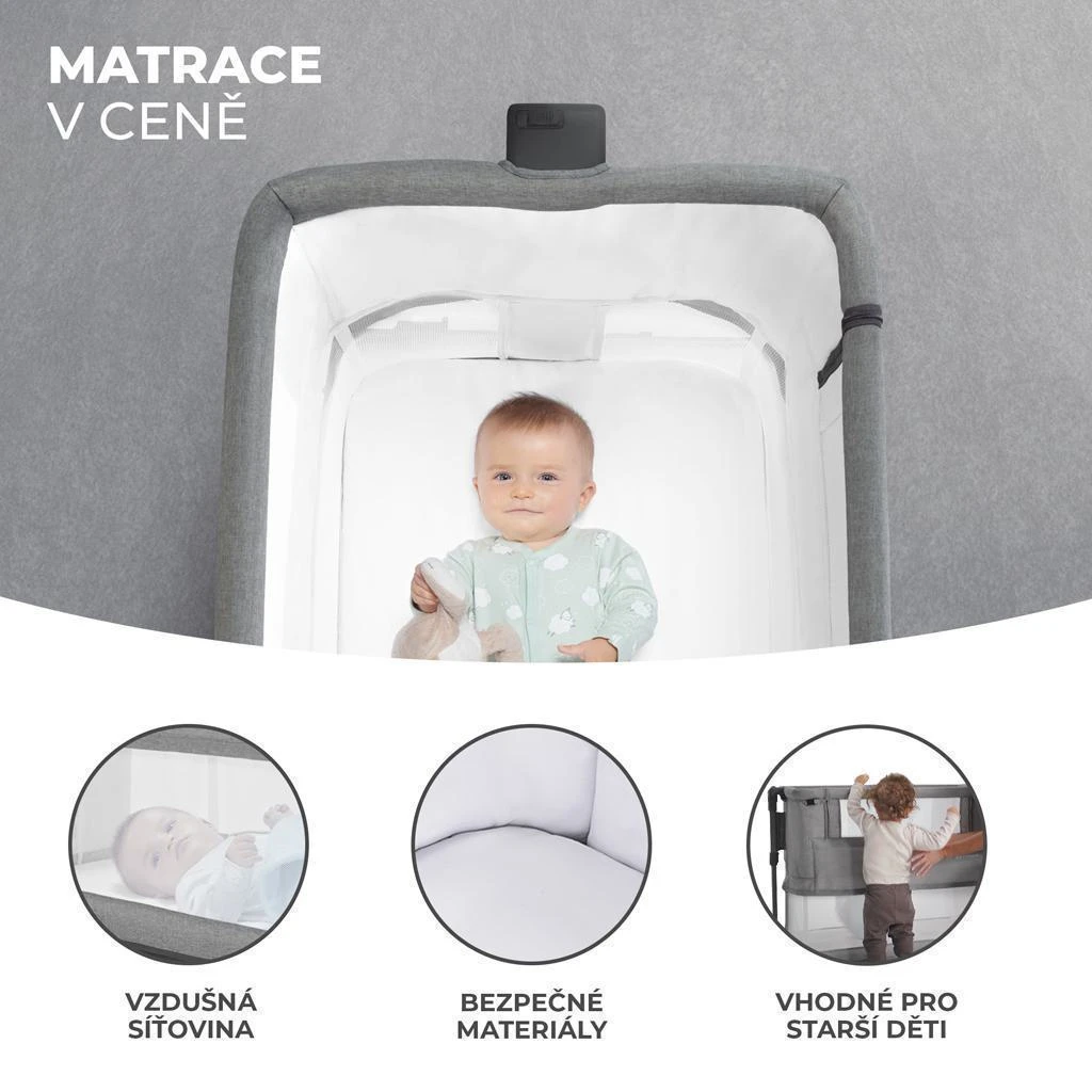 - Ve funkci přistýlky se na straně spuštěné bočnice nachází síťka. Díky tomu můžete mít dítě vždy na očích.