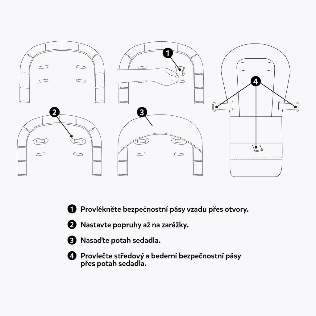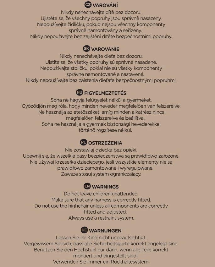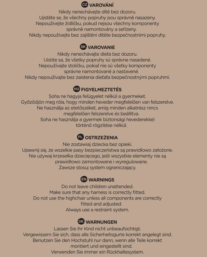 UPOZORNĚNÍ! Nikdy nenechávejte dítě bez dozoru. Ujistěte se, že všechny popruhy jsou správně nasazeny. Nepoužívejte židli, pokud nejsou všechny komponenty správně namontovány a seřízeny. Nikdy nepoužívejte bez zajištění dítěte bezpečnostními popruhy.