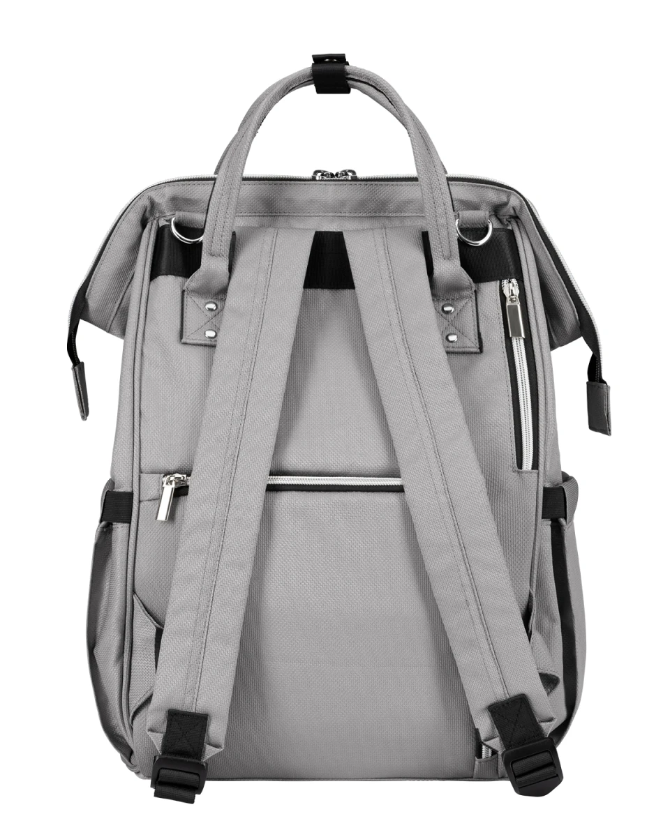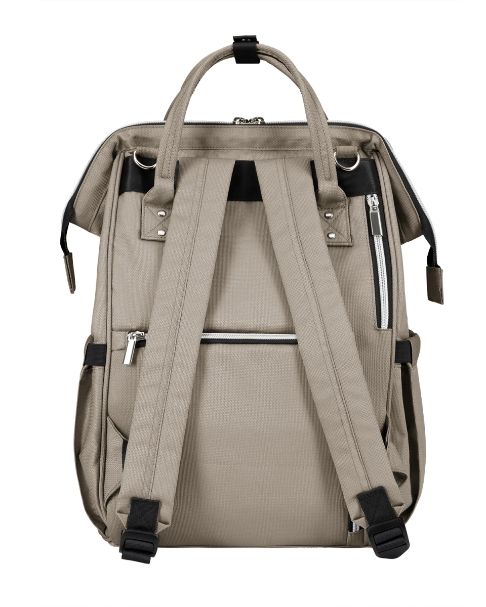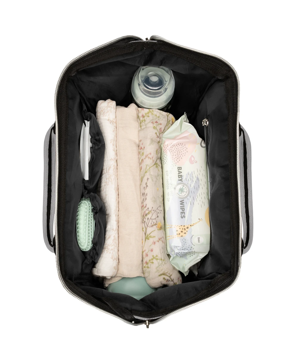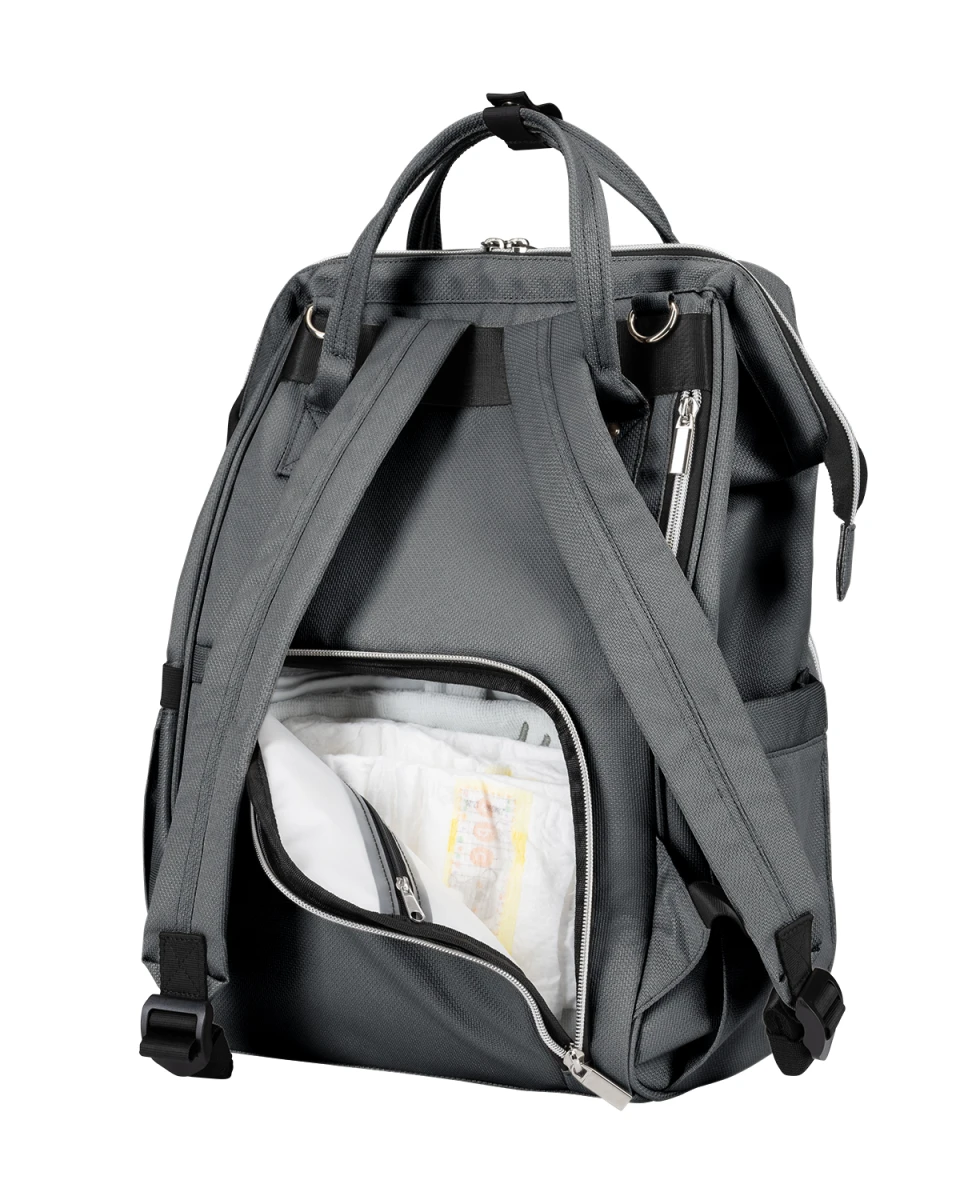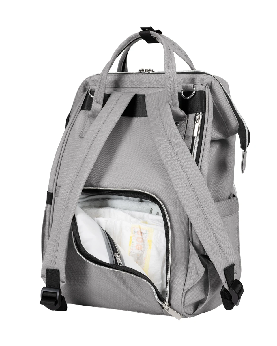 Batoh je možné zavěsit na kočárek, nosit na zádech i v ruce.
