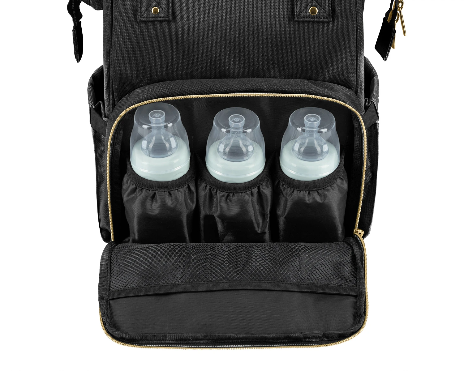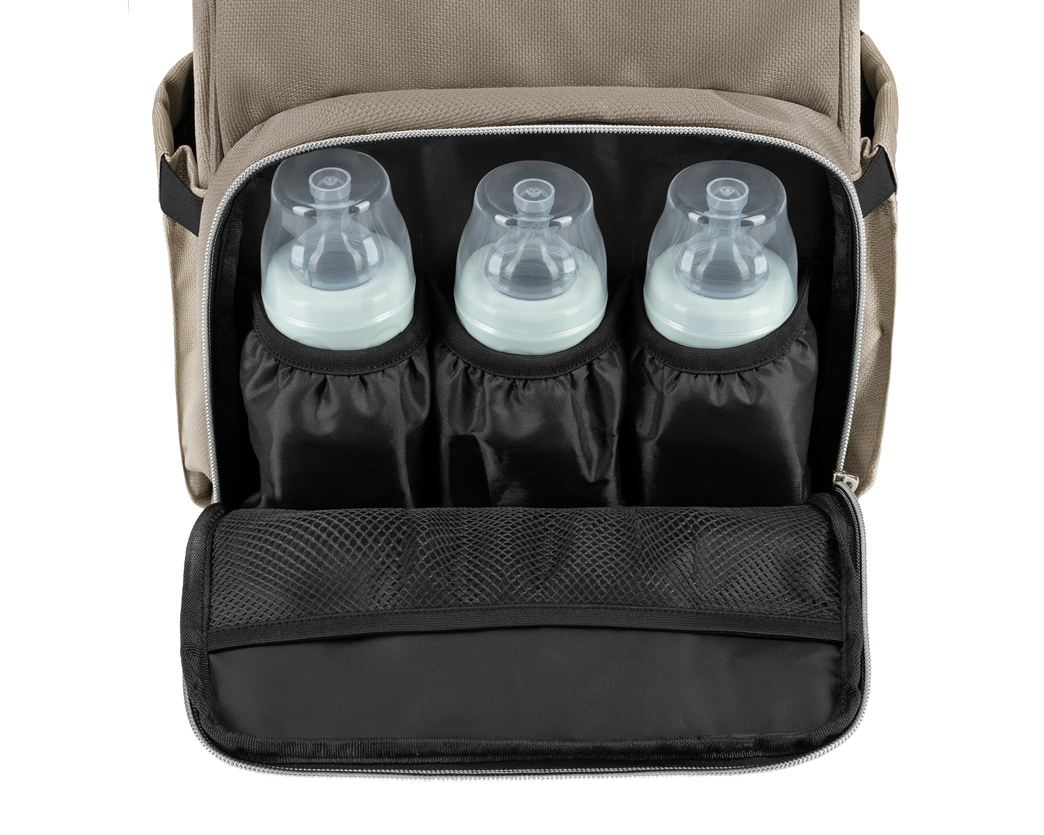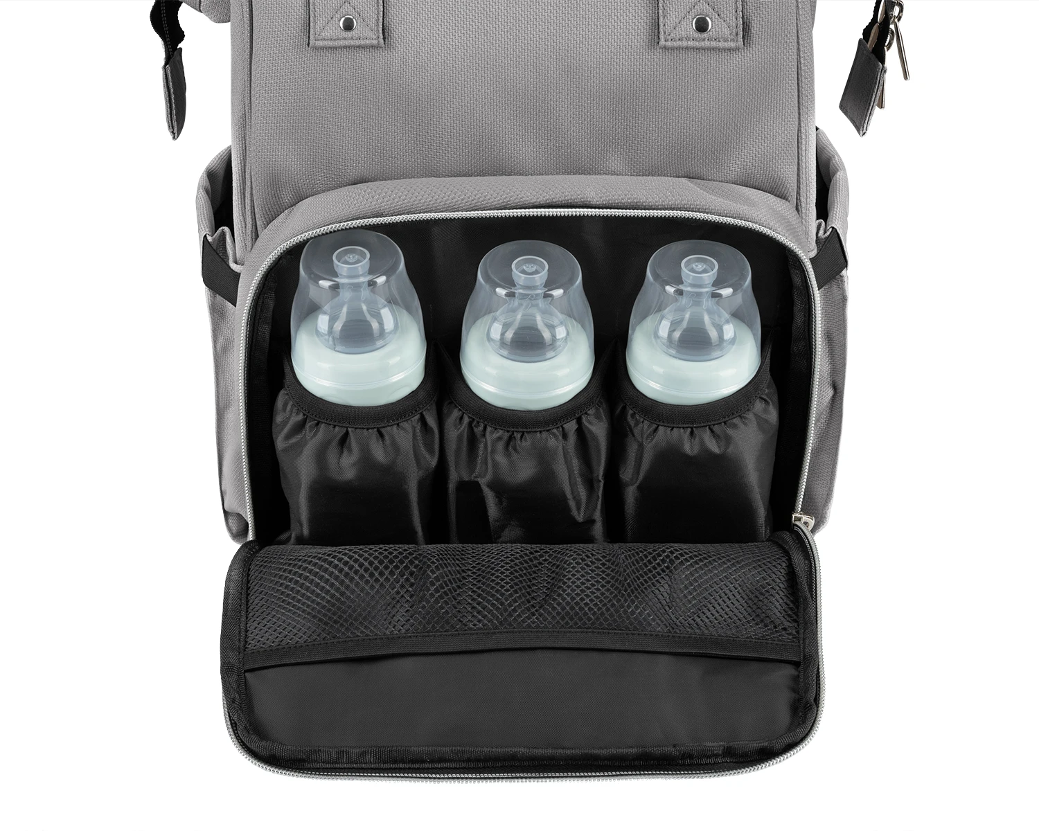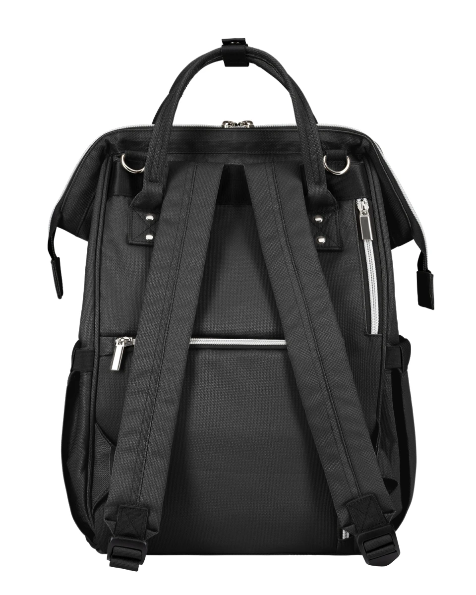Batoh je možné zavěsit na kočárek, nosit na zádech i v ruce.