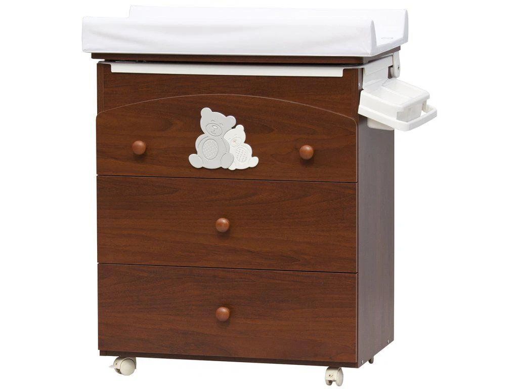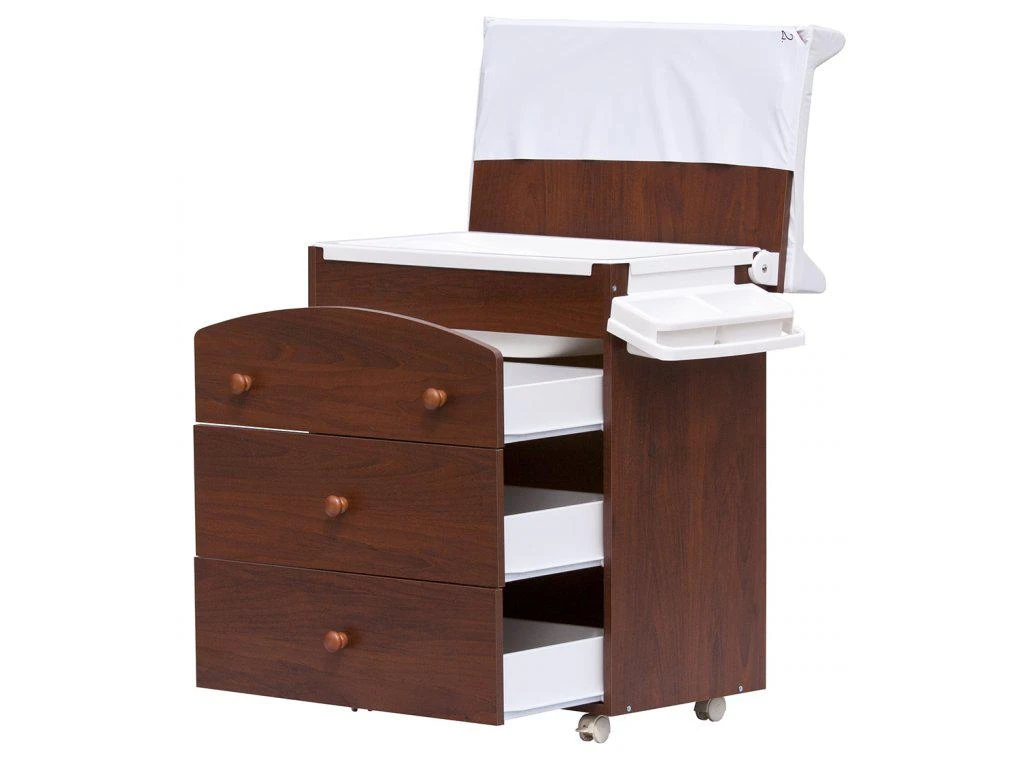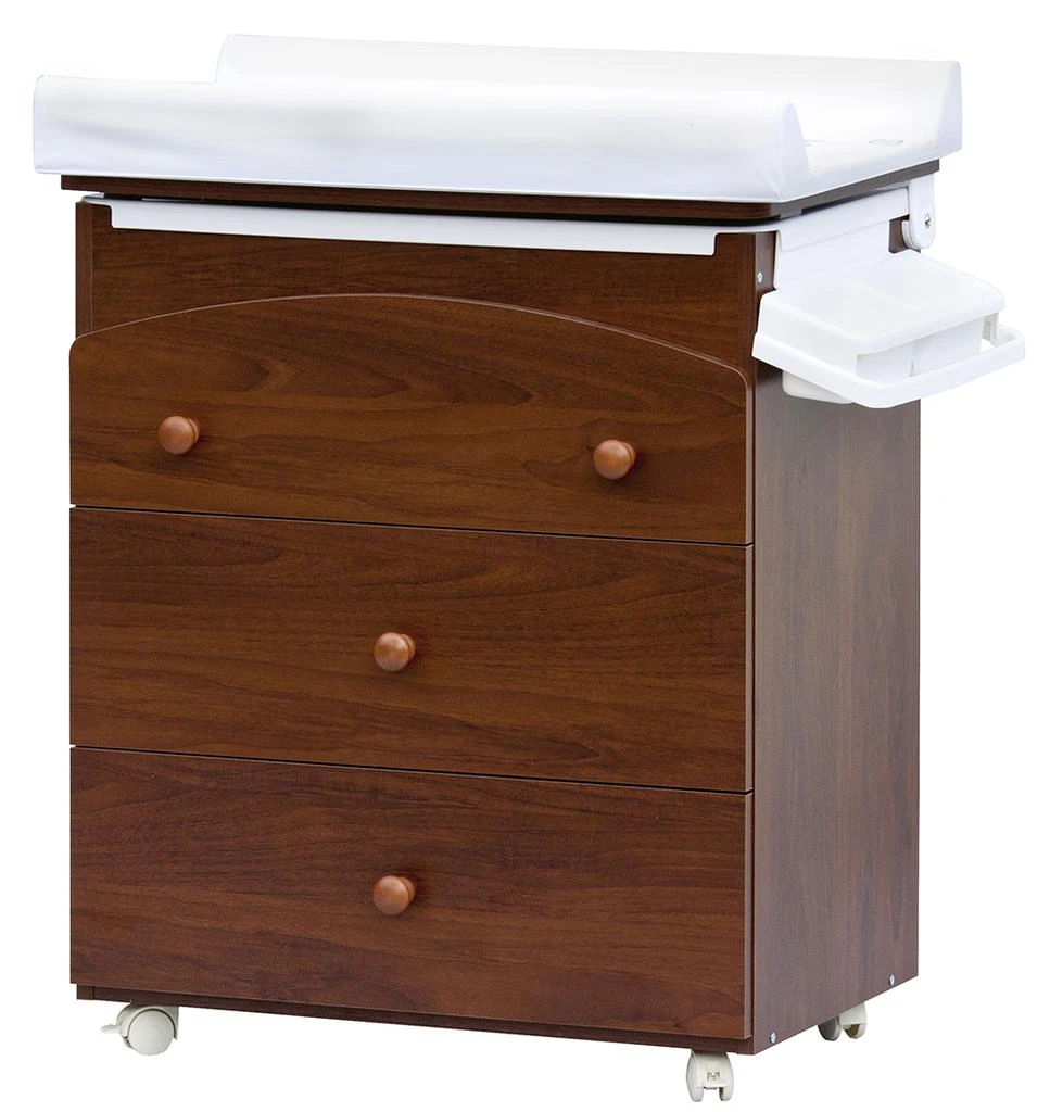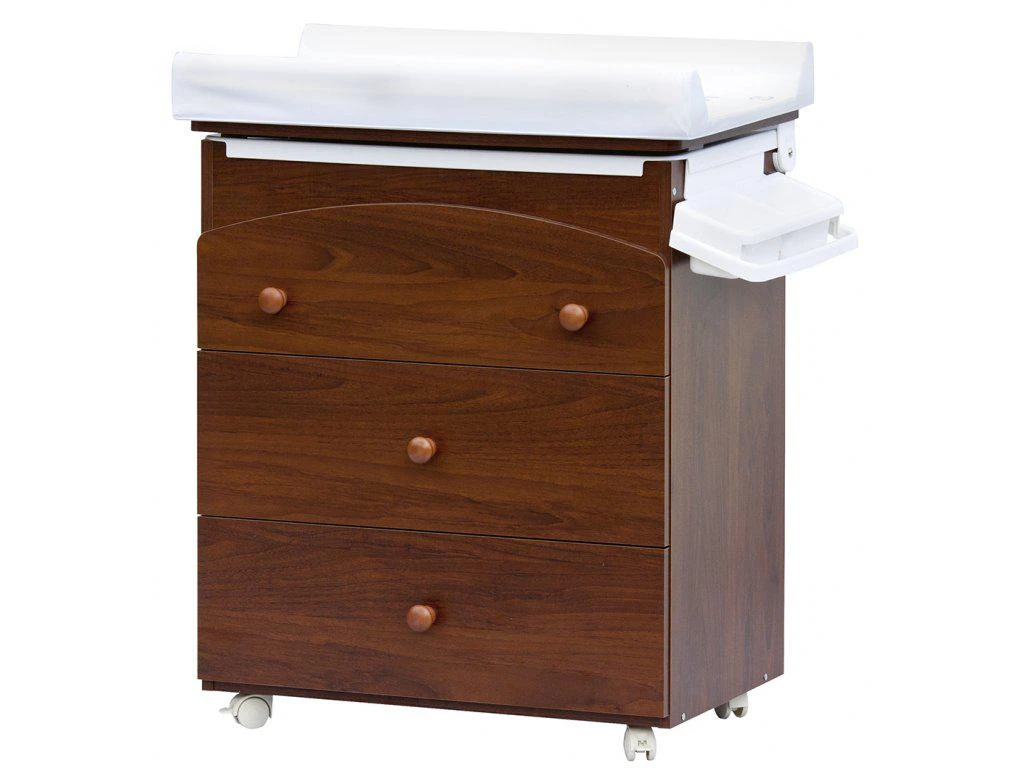 Laminátová přebalovací komoda je doplněna o plastovou vaničku s odkládacími boxy. Vanička je umístěna pod deskou. Pro snadný odvod použité vody je komoda doplněna výtokovou hadicí s uzávěrem. Komoda je také opatřena plastovými kolečky, dvě jsou s brzdou. Komodu lze tedy velmi jednoduše přesouvat dle potřeby. Horní deska nad vaničkou je připevněna na otočných kloubech pro snadné zvedání. Komoda je dále opatřena třemi velkými šuplíky.