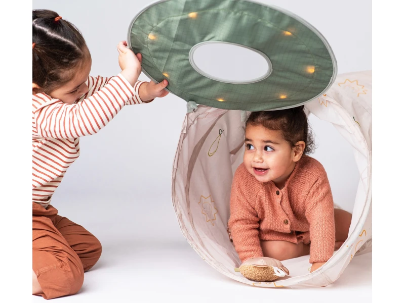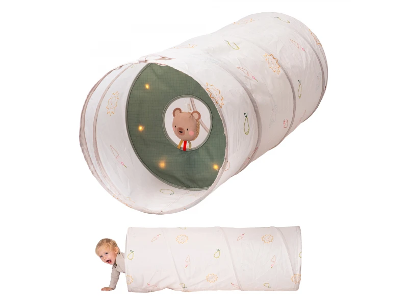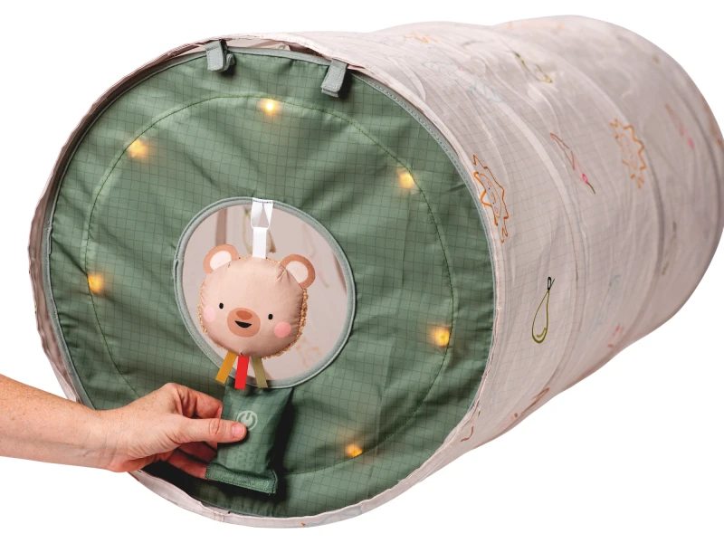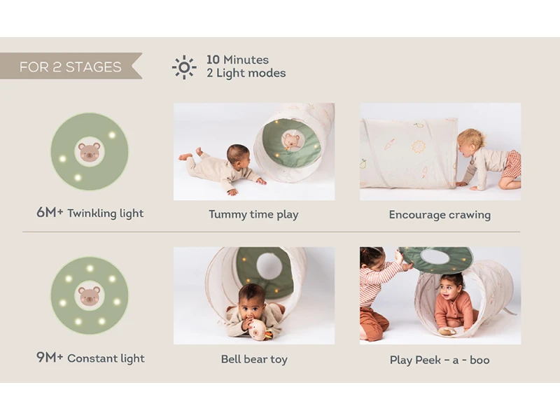 Dva světelné režimy - jemně blikající režim podporuje hru na bříšku, zatímco trvalé světlo motivuje dítě k lezení tunelem, každý režim trvá 10 minut