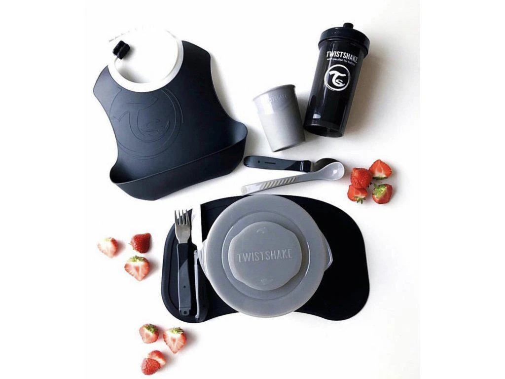 Na podložku sedí všechny talíře a misky Twistshake.