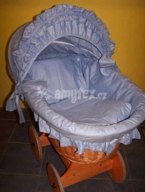 Košík LUX se stříškou (proutěný košík, podvozek na velká kolečka, peřinka 75/75,polštář 35/40, povlečení na peřinku, povlečení na polštář, tlustý ochranný límec s volánkem, matrace)