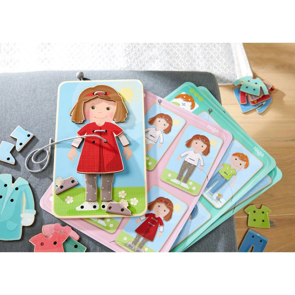 Hračka obsahuje: 1 oboustranně potištěnou desku pro navlékání nití, 1 dlouhou nit, 36 závitových kartiček a 3 oboustranně potištěné předlohy.