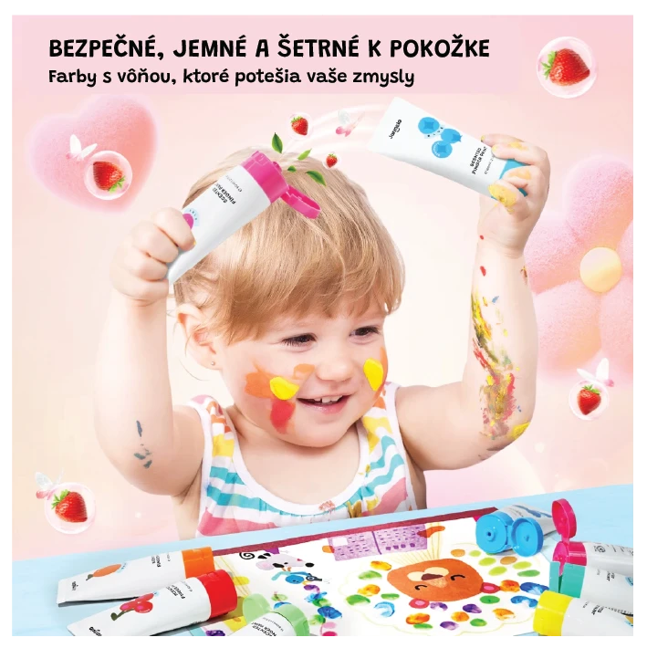 - 8 omyvatelných barev + příjemné vůně (např. třešeň, banán, jahoda, hroznové víno, pomeranč...) pro multismyslovou hru