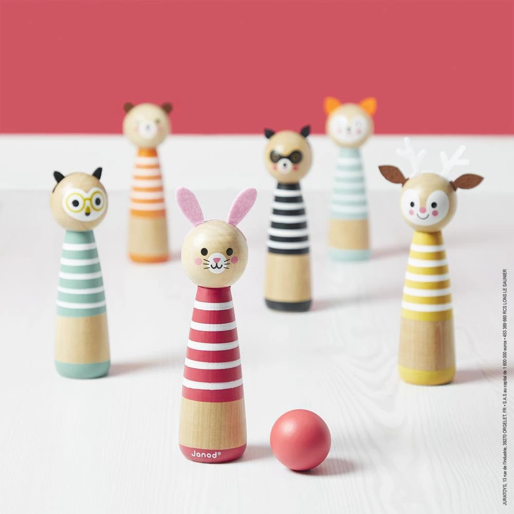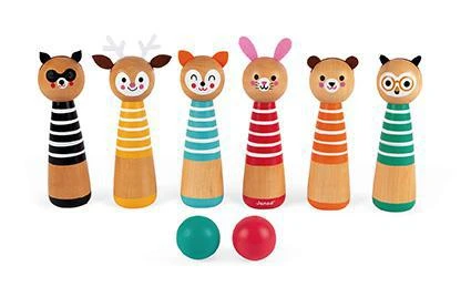 Hra obsahuje 6 dřevěných kuželů se zvířaty motiv a 2 koule. 7 cm.