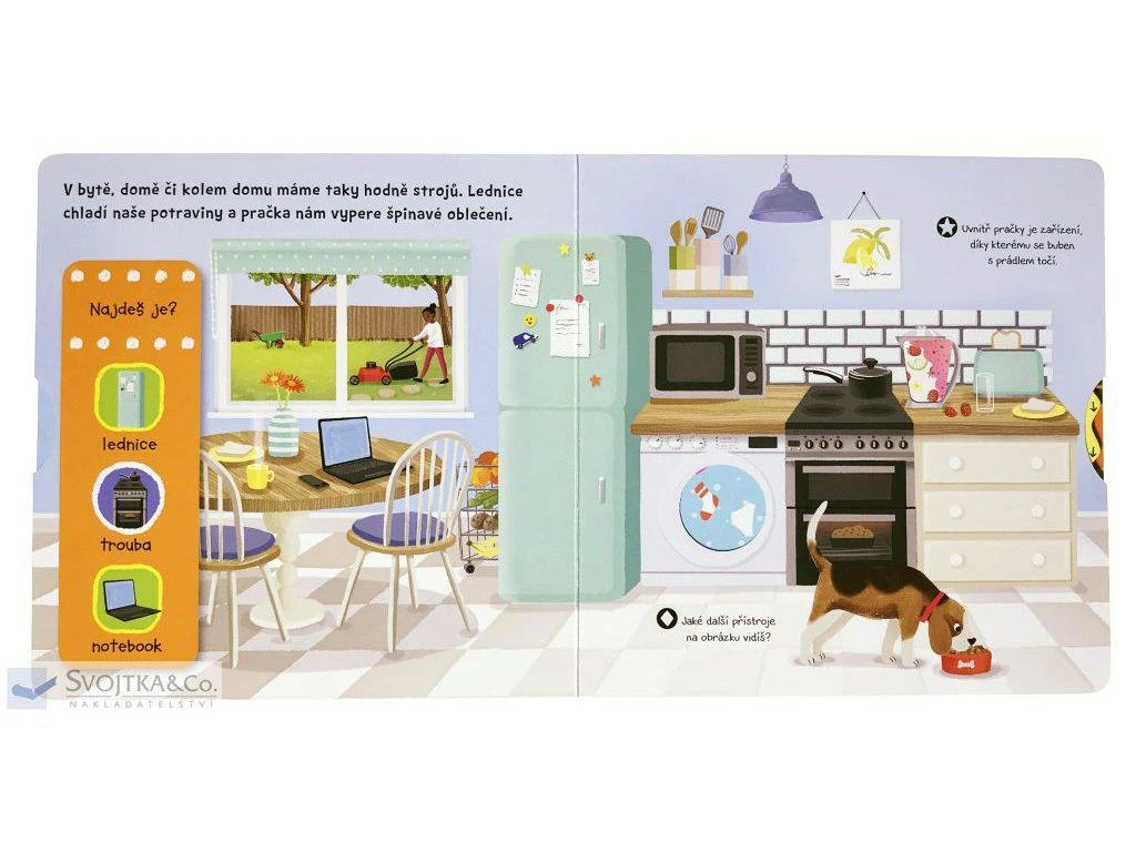 Kniha jako stvořená pro všechny malé objevitele, které zaujal svět strojů a přístrojů. Seznam se se stroji, které pomáhají zemědělcům na poli, taky s těmi, které používají lidé na stavbě. Spousta přístrojů pomáhá i v našich domácnostech. Rozhlédni se doma - jaké přístroje najdeš? A jak fungují různé atrakce na dětském hřišti? Kniha z řady První objevy je bohatě ilustrovaná a v každé scéně má pohyblivé prvky, díky nimž se děti seznámí s úžasným světem strojů a zároveň si procvičí jemnou motoriku.