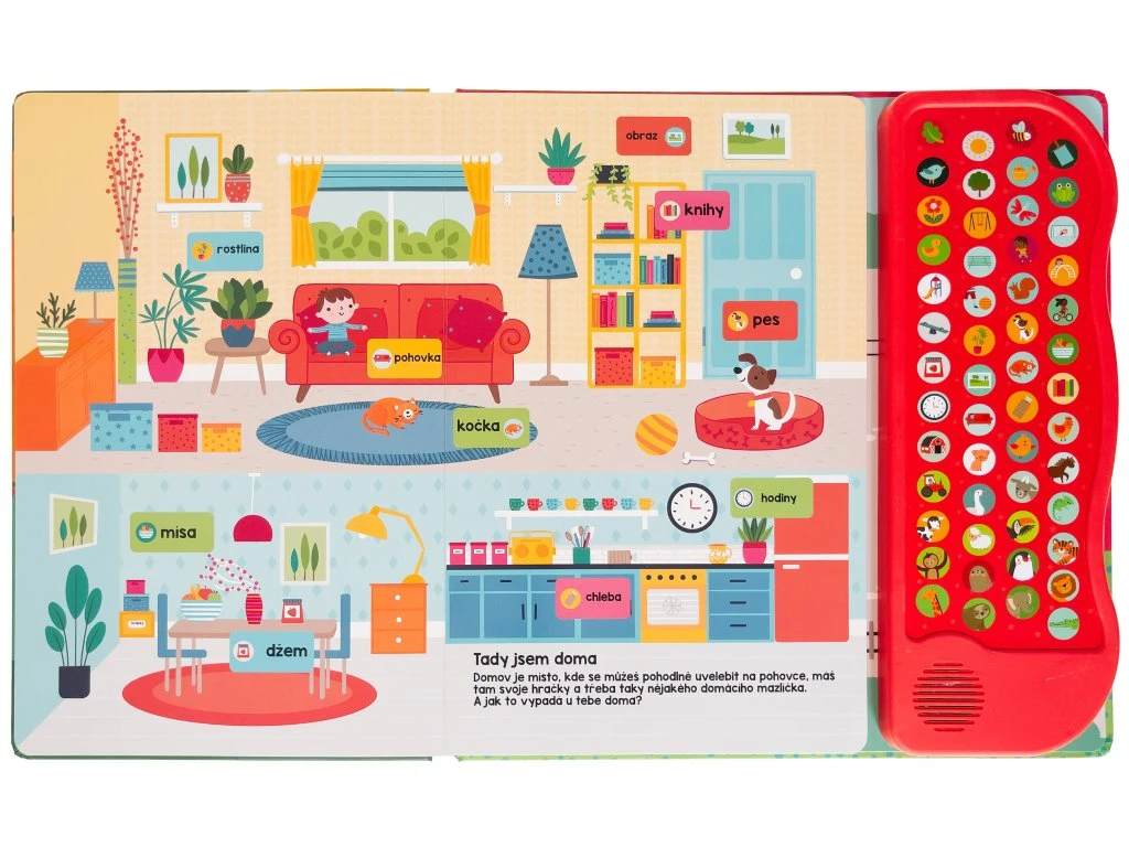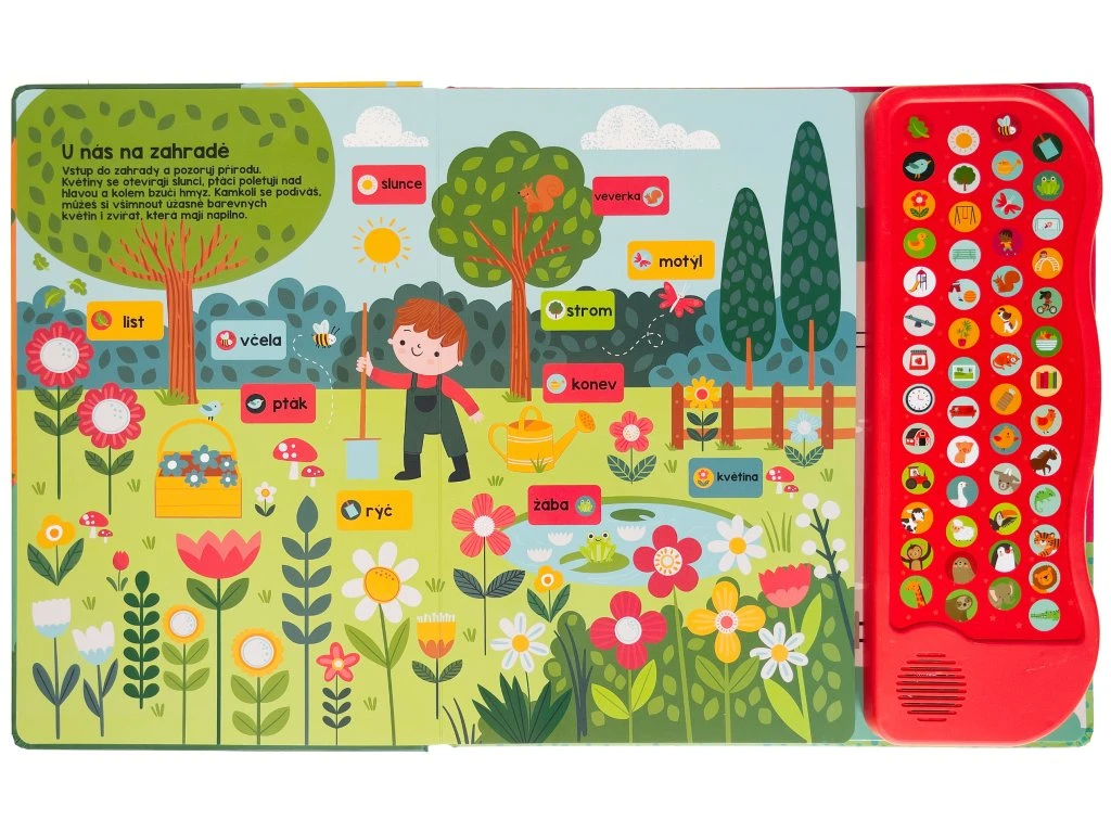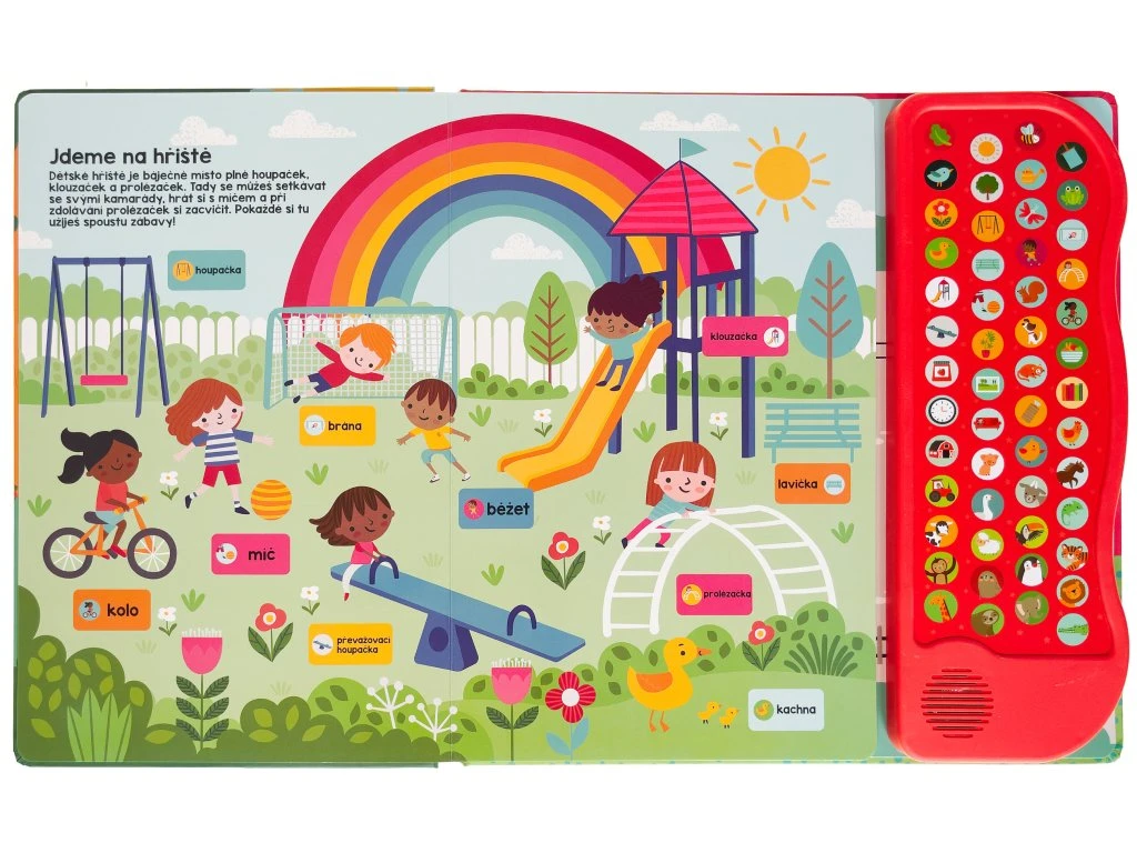 Interaktivní kniha plná roztomilých obrázků s 52 zvuky představuje ideální pomůcku pro malé děti, které objevují svět kolem sebe a učí se nová slova. Povídejte si nad obrázky a rozšiřujte slovní zásobu svého dítěte hravou formou. Ať už jsme doma, na zahradě, na hřišti nebo v zoologické zahradě, všude tam se děje spoustu zajímavých věcí, o kterých si můžeme povídat.