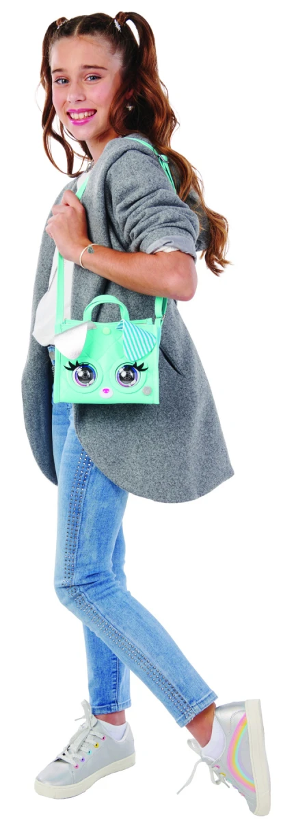 Reagují na dotek, mrkají a mají více než 30 nových zvuků a reakcí! VIPooch má tkanou umělou kůži v zelenomodré barvě, ouška v kovově stříbrné s pruhy, oči inspirované stylem pop-art a zapínání na patentku. Díky dvojitým popruhům můžete VIPooch nosit za držadla nebo prodloužit delší popruh na délku až 100 cm a nosit ji jako tašku přes rameno nebo crossbody!