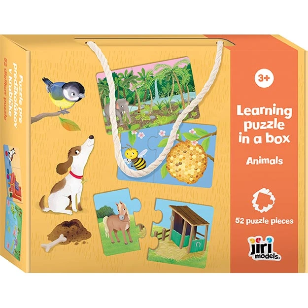 Krabička obsahuje 26 barevných puzzle kartiček s různými motivy, díky nimž se děti učí poznávatzvířátka a ještě si jejich skládáním procvičují jemnou motoriku.