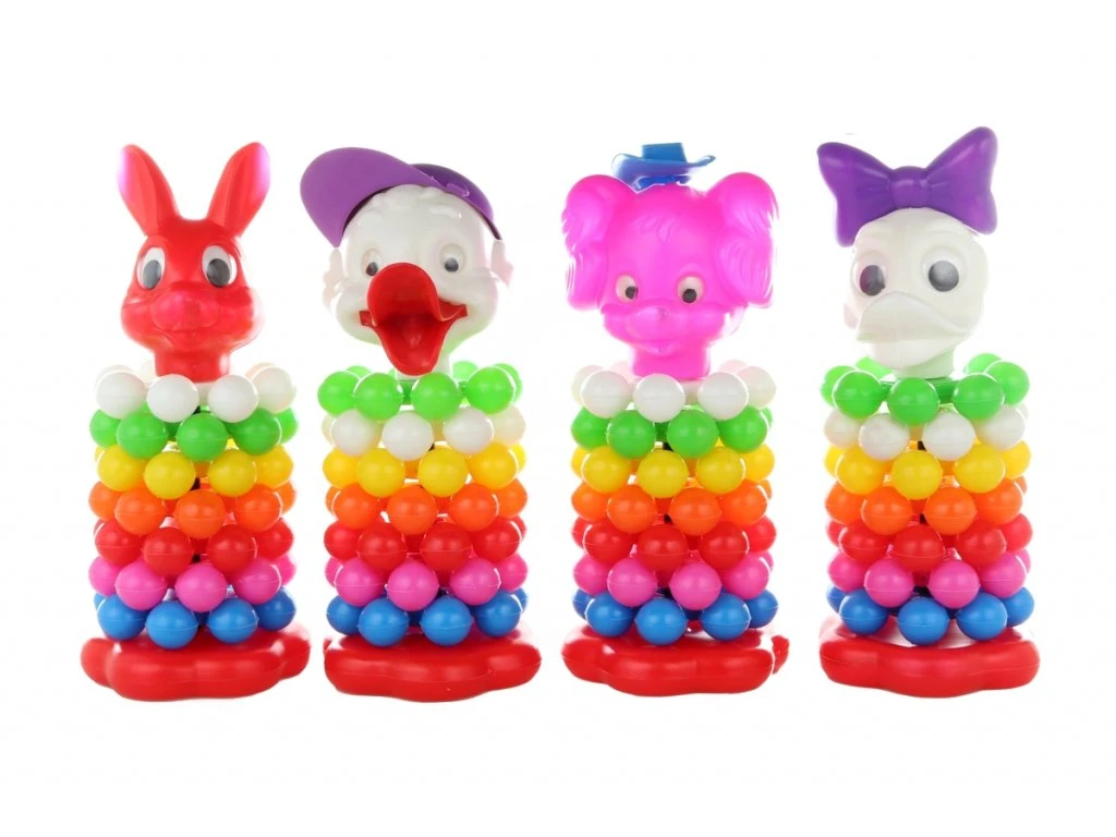 Barevná pyramida s plastovými kuličkami a veselou zvířecí hlavou je zábavná hračka určená pro děti od 3 let. Hračka má přibližně 26 cm a tvoří ji pevná základna, na které jsou naskládány lehké plastové kuličky v několika barevných řadách. Na vrcholu se nachází postavička zvířátka, například králíček, kačenka, slon nebo jiný motiv, což hračce dodává hravý vzhled a děti motivuje k manipulaci.