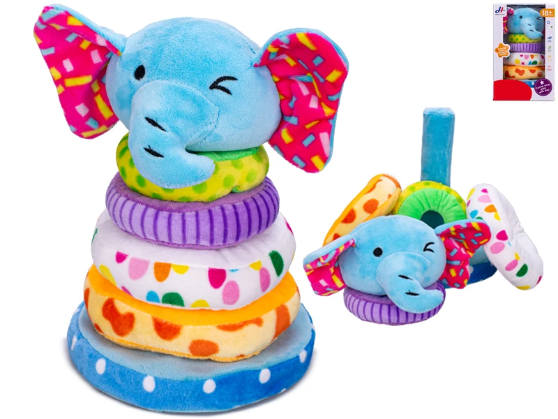 Pyramida slon 21 cm plyšová s pískátkem a kroužky 4 ks 18 m+