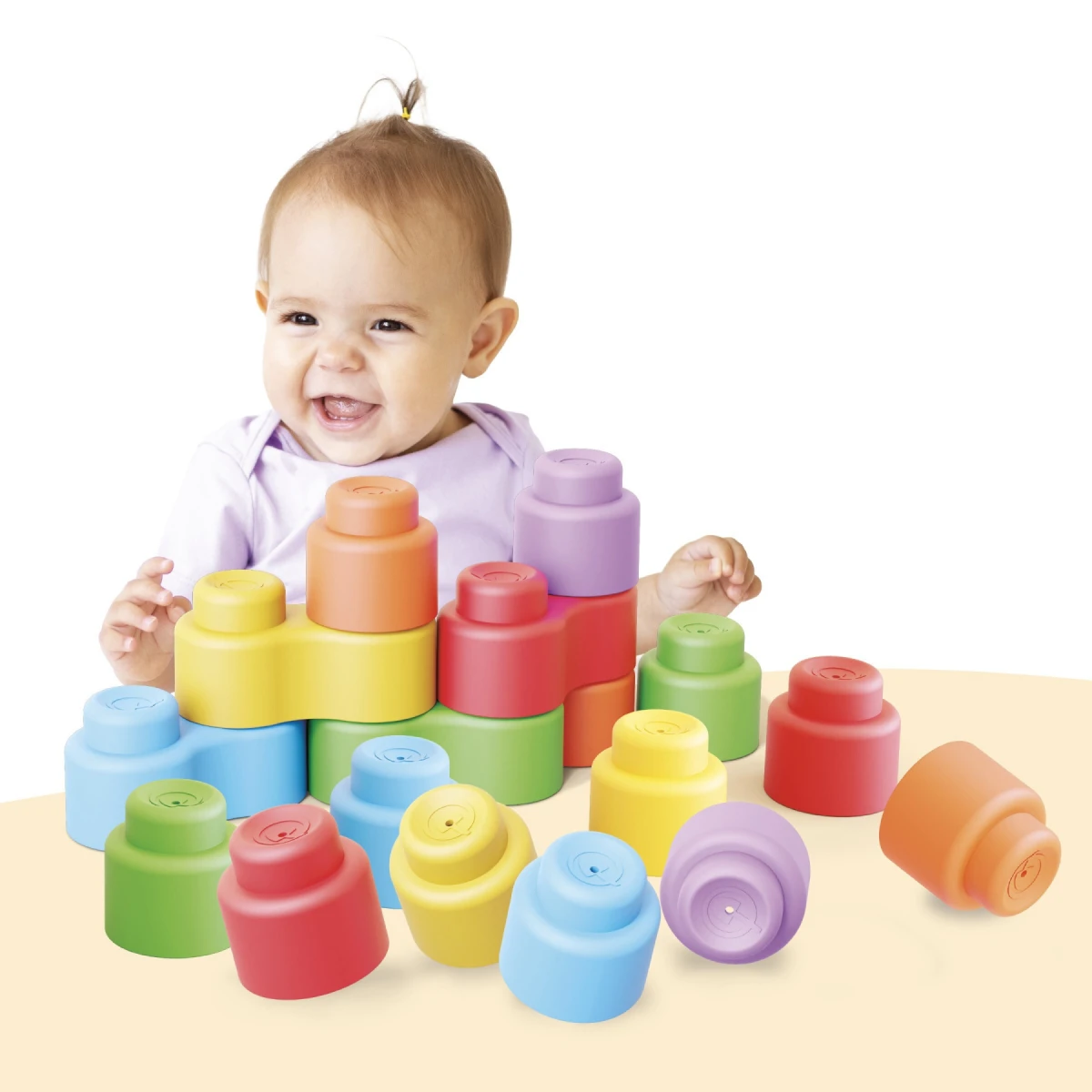 Tato sada obsahuje 28 velkých, měkkých a barevných bloků vyrobených z bezpečného, lehce vonícího materiálu, speciálně navržených tak, aby stimulovaly smyslový, motorický a kognitivní vývoj. Každý prvek má zaoblené tvary a snadno uchopitelné povrchy, ideální pro malé ručičky. Díky jasným barvám a intuitivnímu systému propojování mohou děti volně skládat, spojovat a kombinovat dílky a vytvářet tak nekonečné konstrukce. Ideální pro rozvoj jemné motoriky, koordinace ruka-oko a představivost.