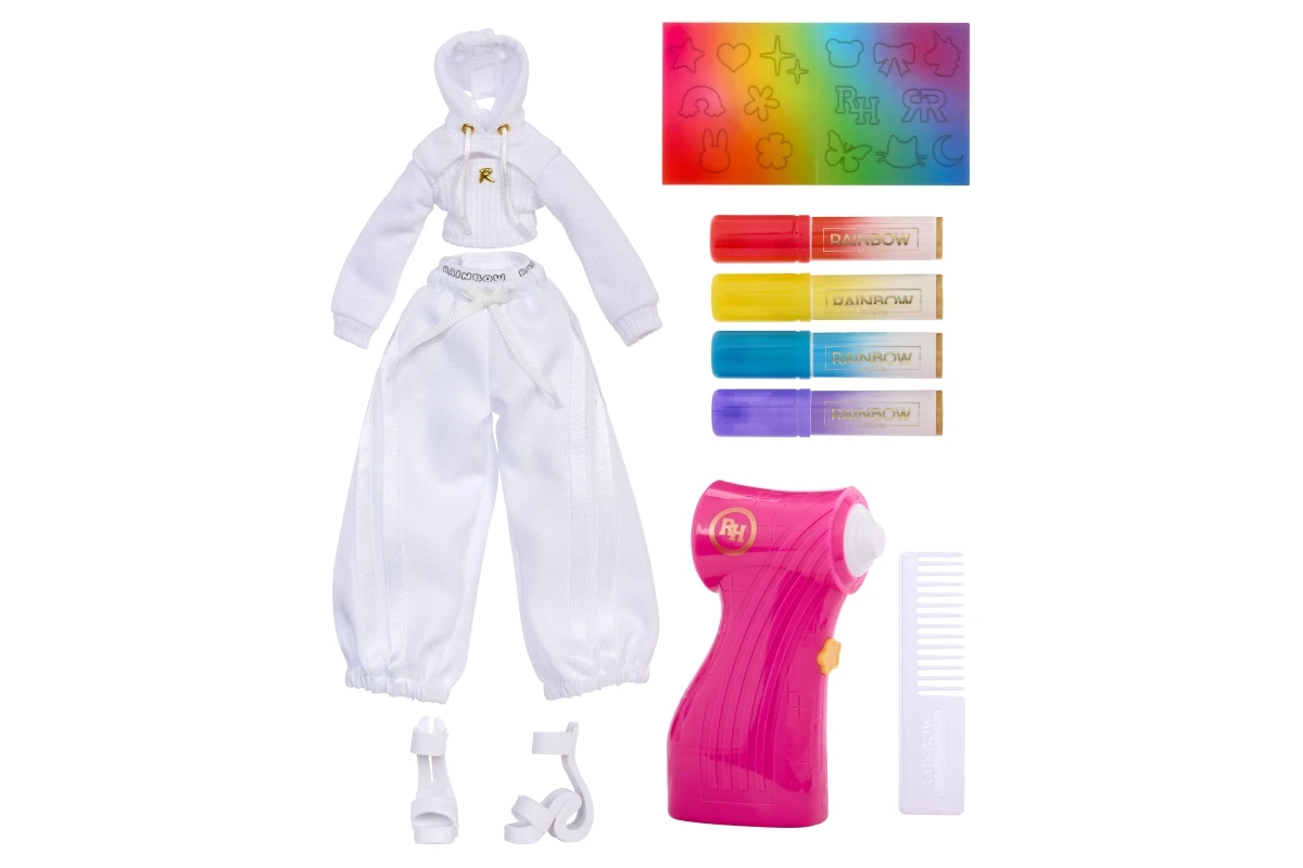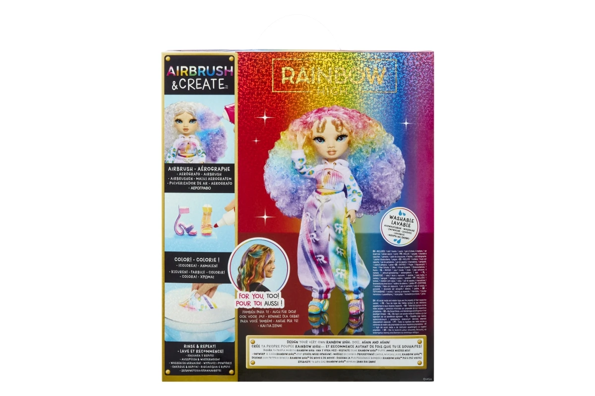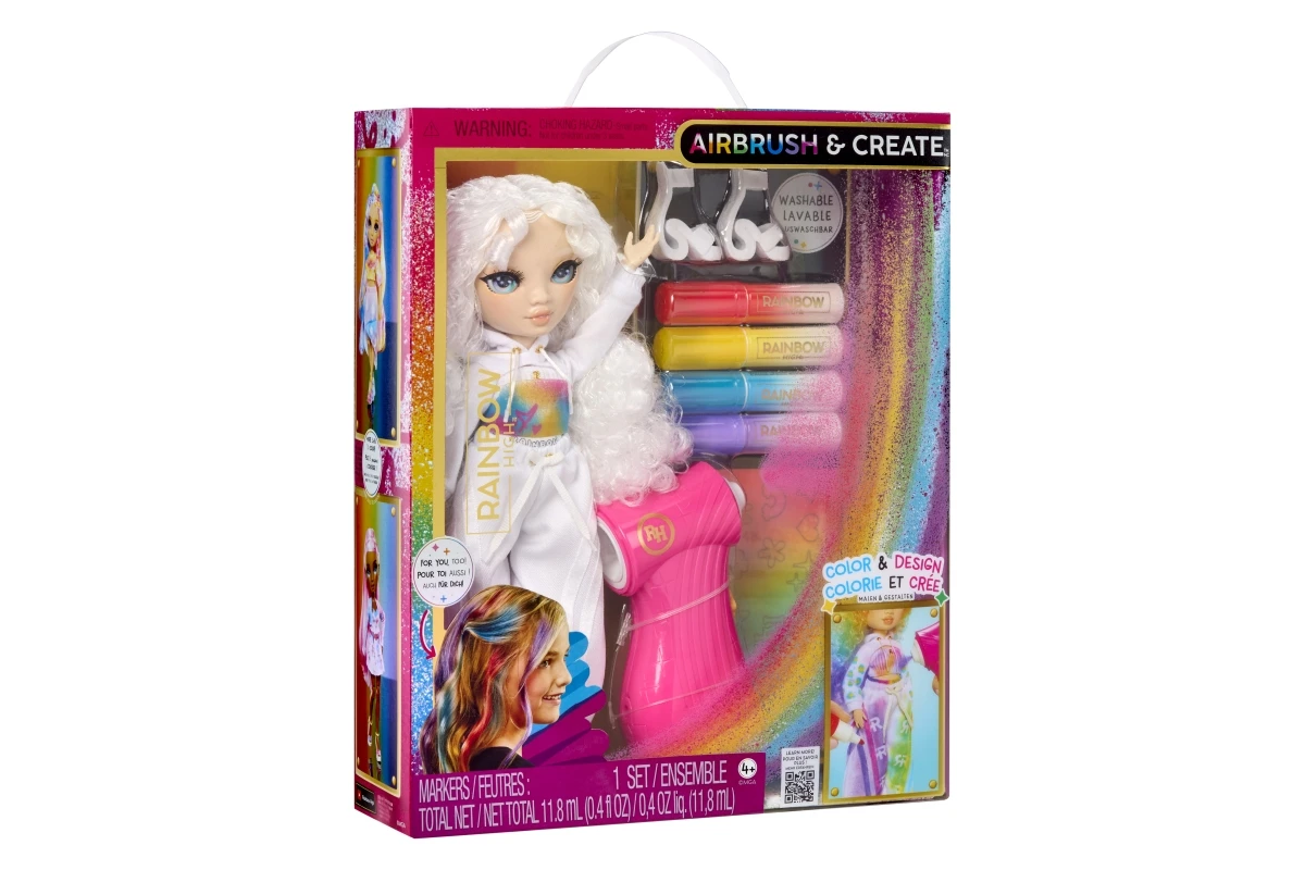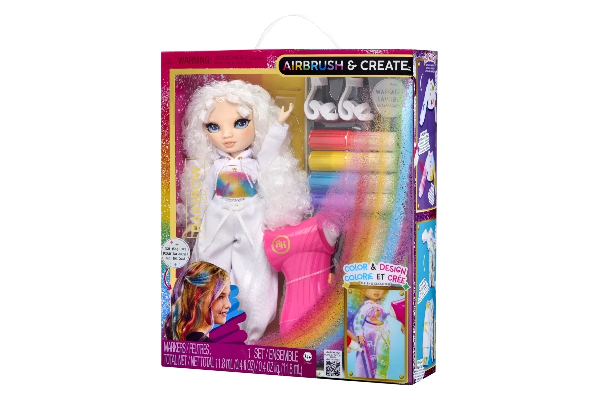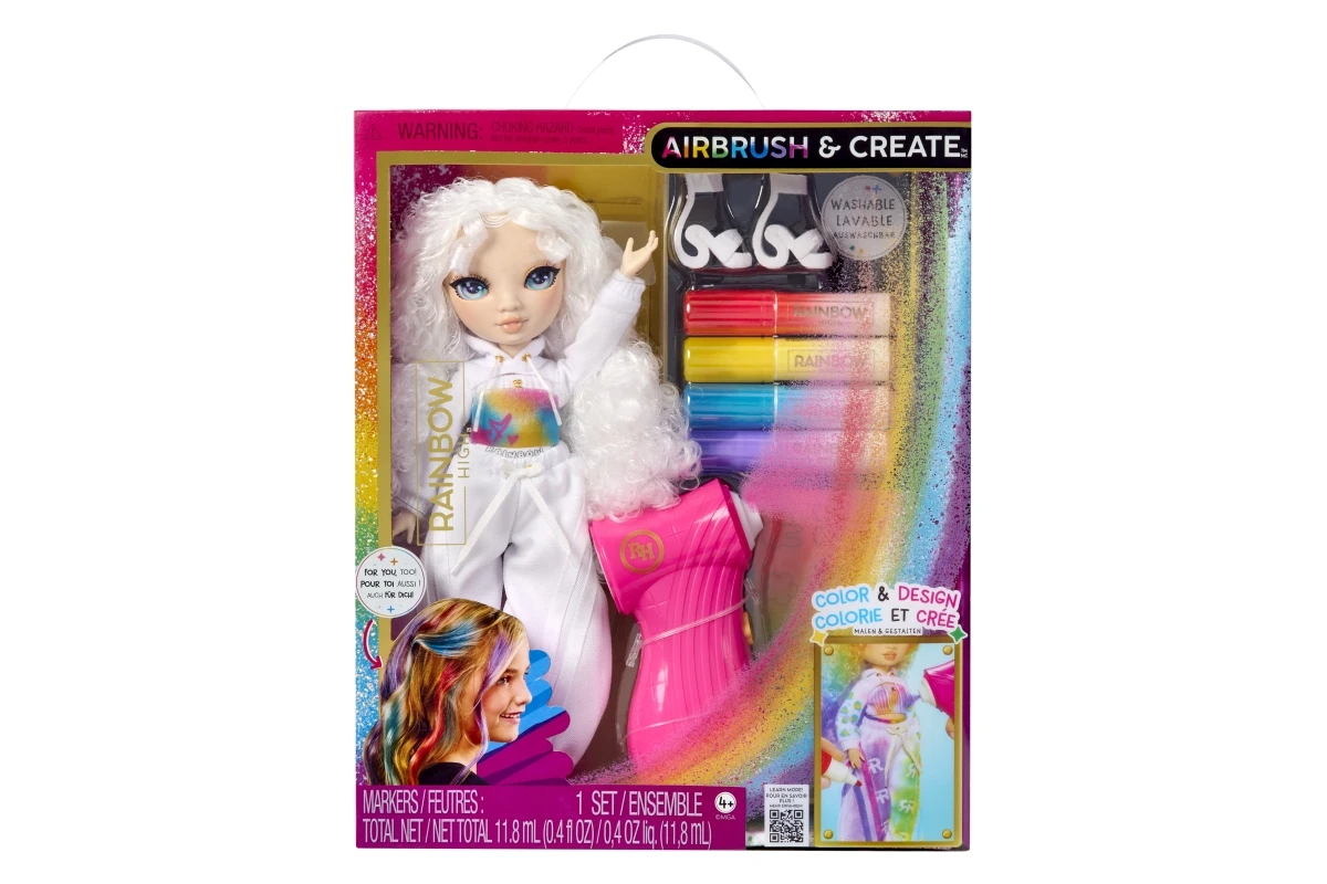 Panenka je celá v bílém, připravená stát se tvým osobním uměleckým plátnem. Pomocí airbrush stříkacího pera na stlačený vzduch a omyvatelných duhových fixů v červené, žluté, modré a fialové barvě můžeš vytvářet nekonečné kombinace. Vybarvi její vlasy, oblečení i boty – a když budeš chtít nový design, vše jednoduše umyj a začni znovu!