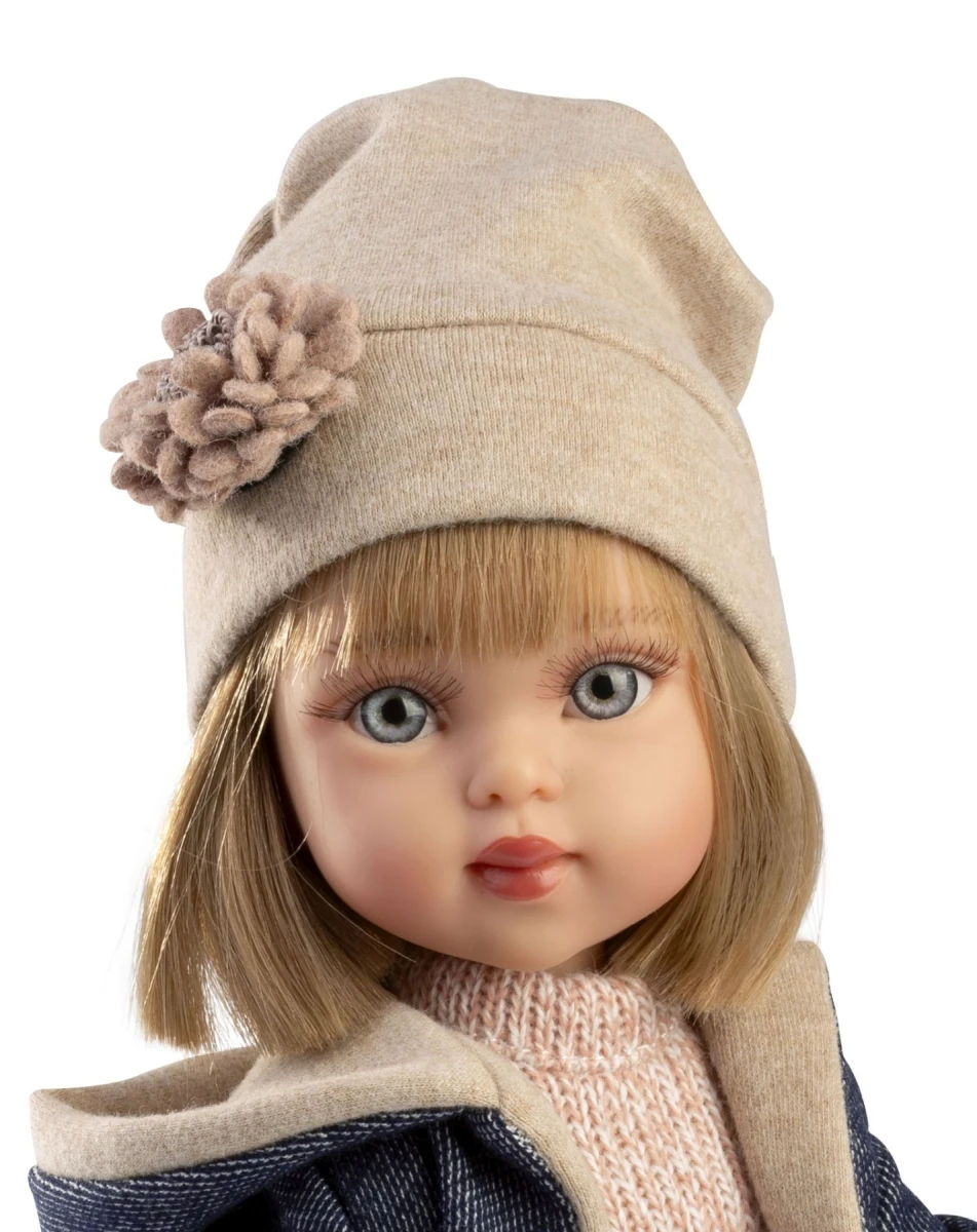 Panenka je polohovací a může i sedět. Velikost panenky 34 cm. Ručně vyrobeno ve Španělsku, baleno v dárkové krabici.