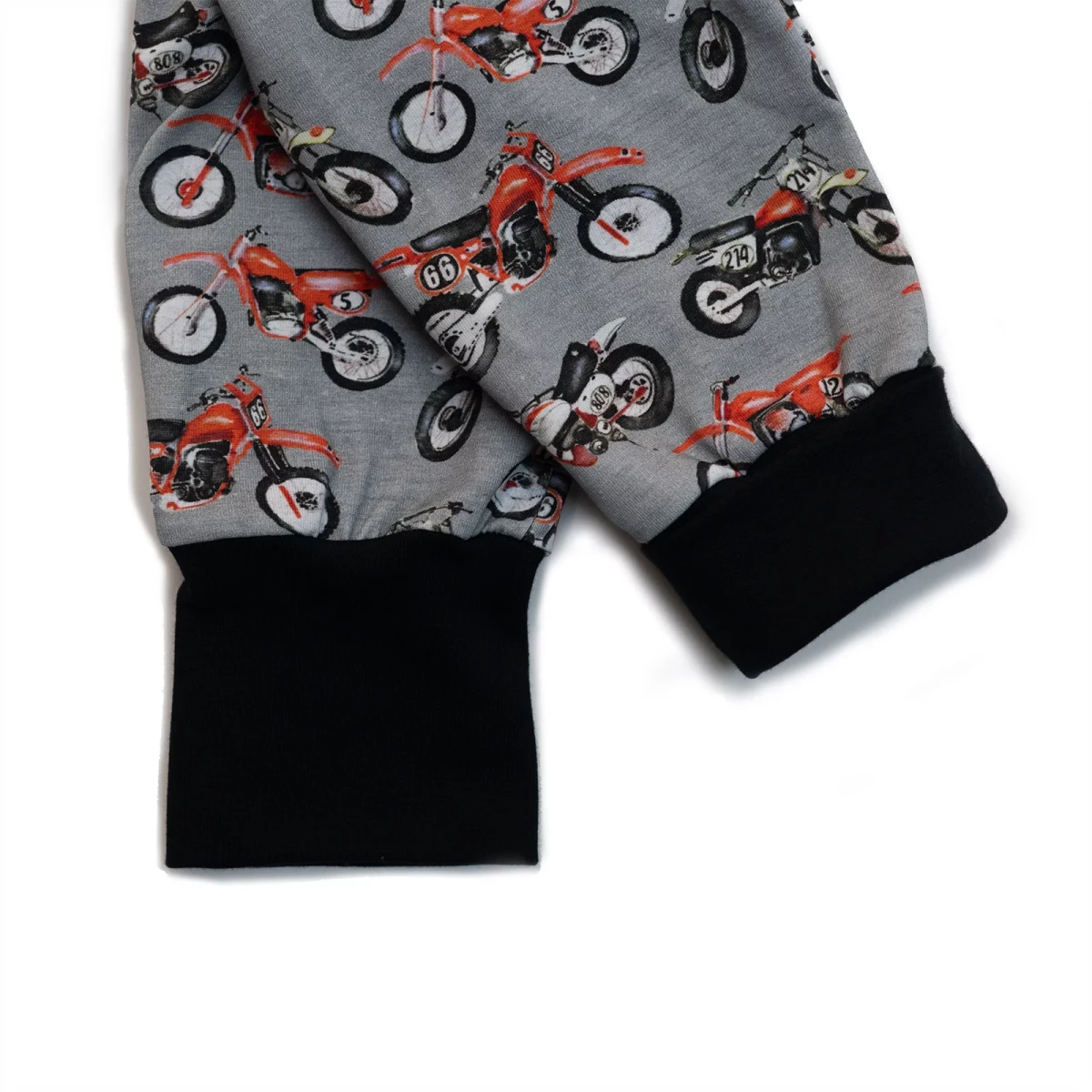 Rostoucí dětské tepláky Motorky jsou pružné dětské tepláky osvědčeného střihu s vysokým bavlněným nápletem v pase. Chlapecké tepláky parkour / baggy mají na spodní části u nohavic vyšší náplet, který perfektně drží na obuvi nebo kolem nohy a hlavně prodlouží tepláy o jednu až dvě velikosti.