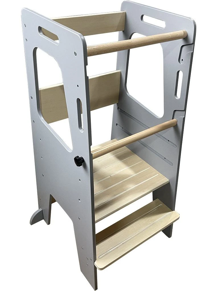 Učicí věž je víceúčelový a funkční kus nábytku, který podporuje samostatnost a motorické dovednosti dětí. Díky chytrému tvaru a ohrádce kolem stojací plochy se dítě cítí stabilně a bezpečně, zatímco má rodič neustálý dohled. Věž snadno přiroubujete ke kuchyňské lince nebo pracovní desce tak, aby byla vždy pevně u překážky naproti schůdku.