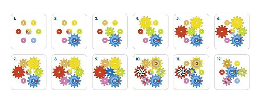 Kolečka jsou potištěna z obou stran a pro děti je tato hra nejen zábavná a pestrobarevně kouzelná, ale je i velkou zkušeností. Kde všude najdou děti taková ozubená kolečka ve svém okolí? Hra je vyrobena ze dřeva.