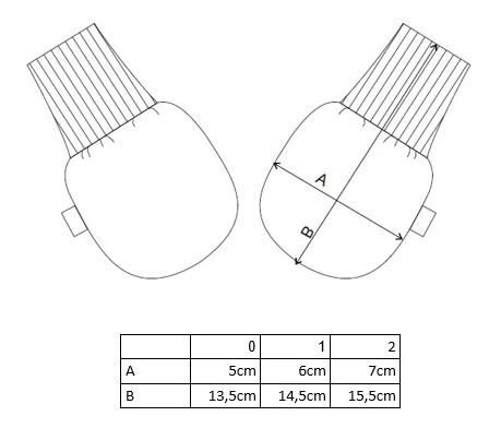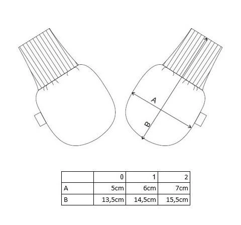 Vel. 0 - 5,5 cm (šířka nápletu), 5 cm (délka nápletu), 8 cm (délka rukavice-wellsoft), 13,5 cm (délka rukavice), 5 cm (1/2 šířka rukavice)