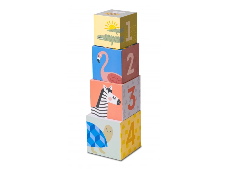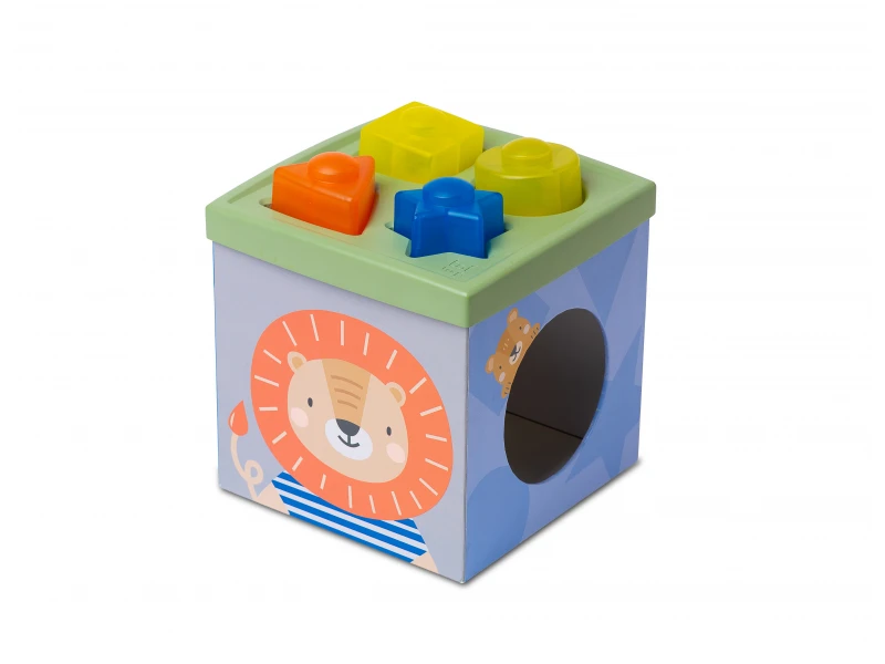 jednotlivé kostky dítě může skládat na sebe do tvaru věže i vkládat jednu do druhé dle velikosti 8 různobarevných tvarů se dítě učí vkládat do správných otvorů v největší kostce nebo do jednotlivých kostek dle barvy či tvaru