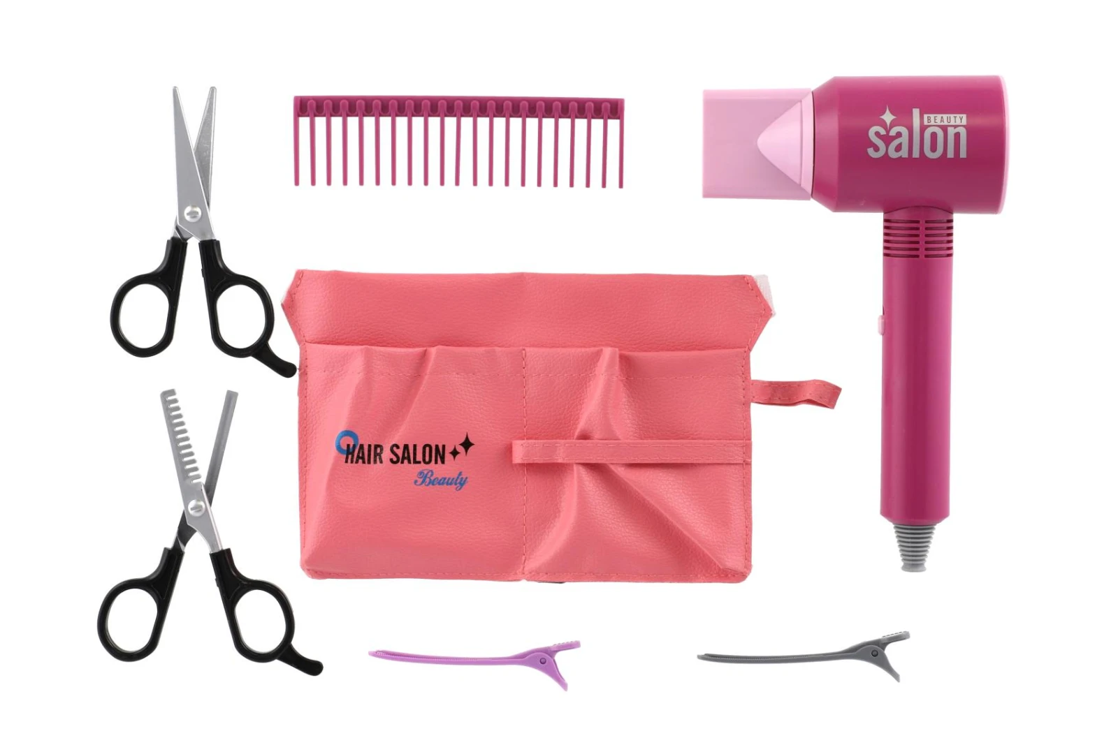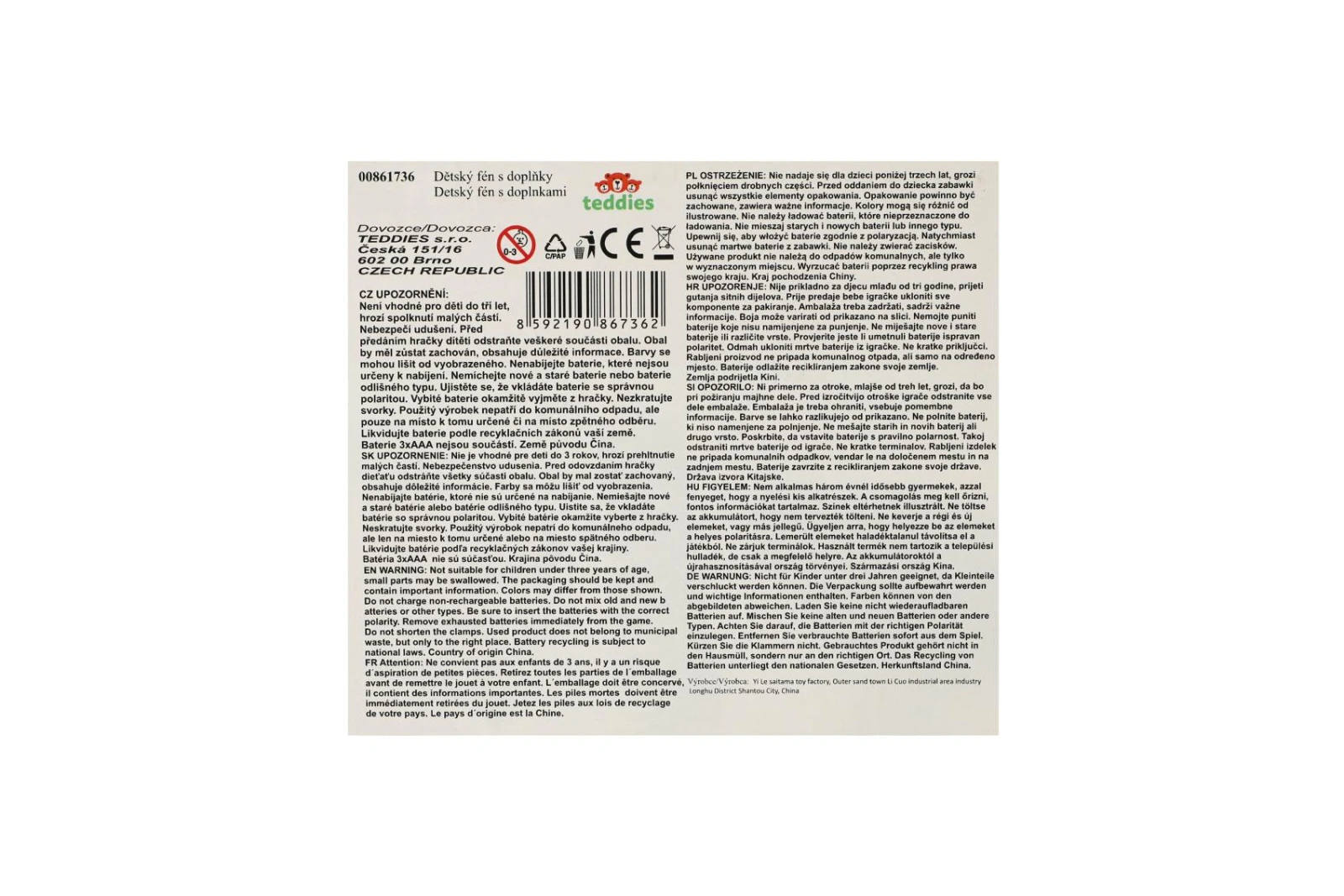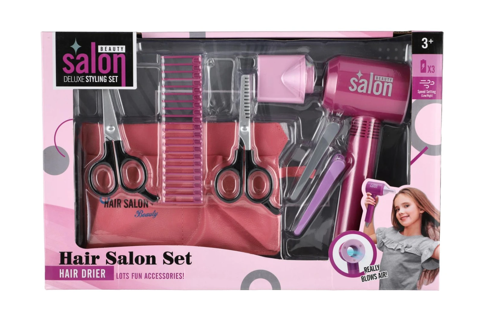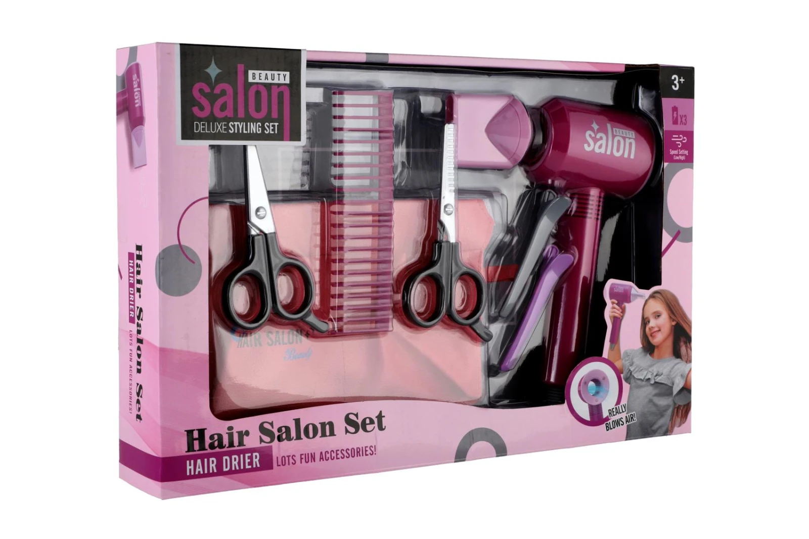 Sada je vyrobena z kvalitního plastu. Fén je na baterie. Baterie 3x AAA nejsou součástí balení.