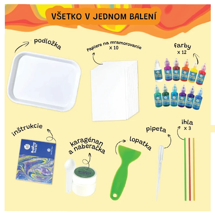 Co obsahuje a čím děti v momentě zaujme? 12 lahví barvy, které se nádherně mísí na vodě10 speciálních papírů připravených na mramorové vzory.