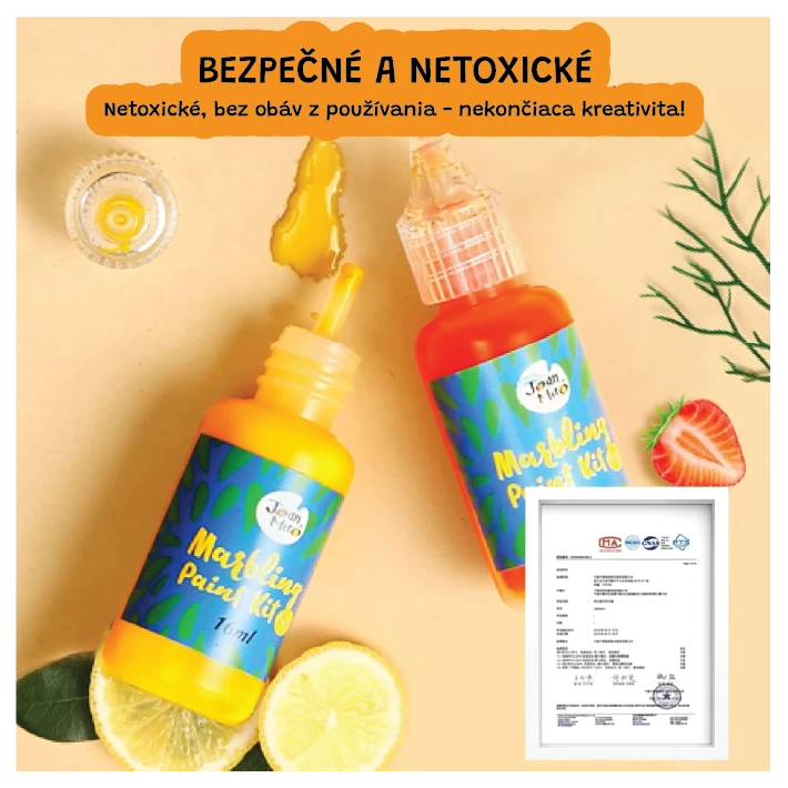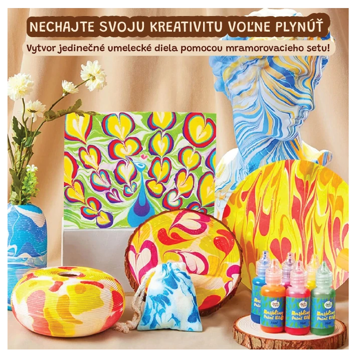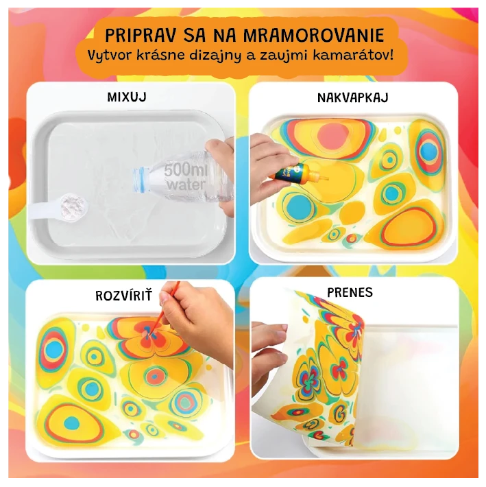 Co obsahuje a čím děti v momentě zaujme? 6 lahví barvy (16ml), které se nádherně mísí na vodě10 speciálních papírů připravených na mramorové vzory.
