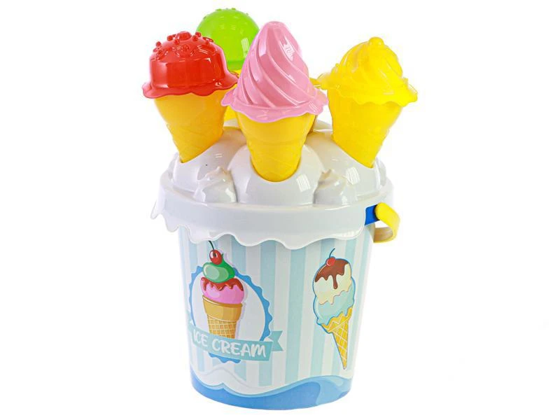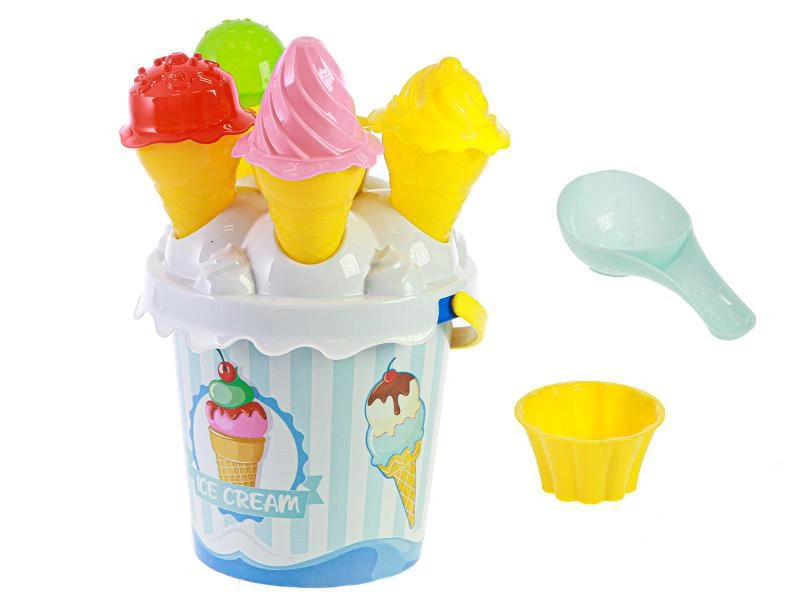 Dětská sada na hraní na pískoviště, na zahradu nebo do vody v podobě cukrárny. Obsahuje kyblíček, 4 kornoutky, 4 barevné čepičky ve tvaru zmrzliny, naběračku a bábovičku ve tvaru malého kelímku.