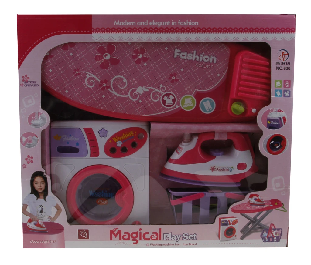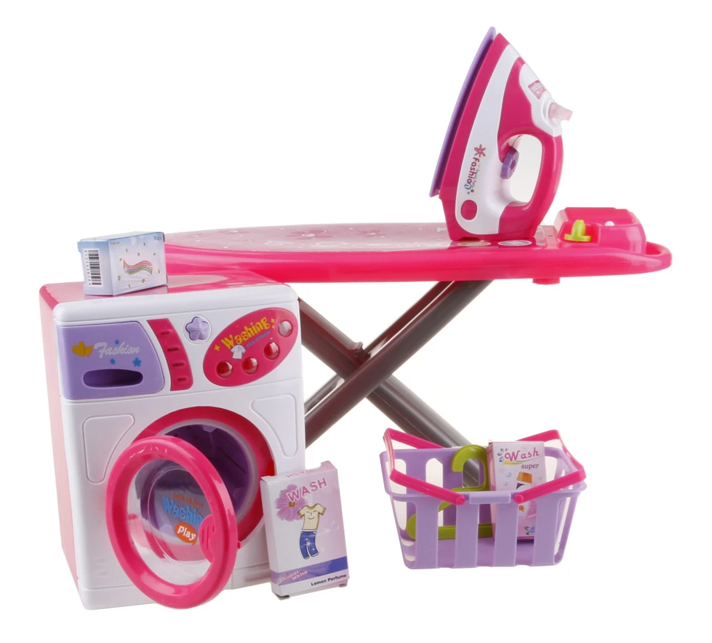 Sada obsahuje mini pračku, žehlící prkno, žehličku a doplňky. Produkty pro děti na hraní, aby si užily spoustu zábavy. Výrobek se světlem. Moderní a elegantní design.